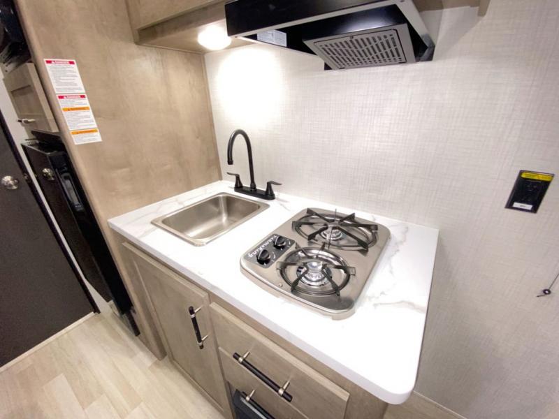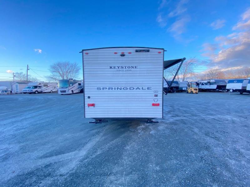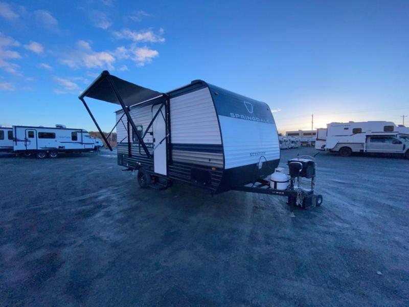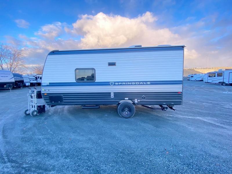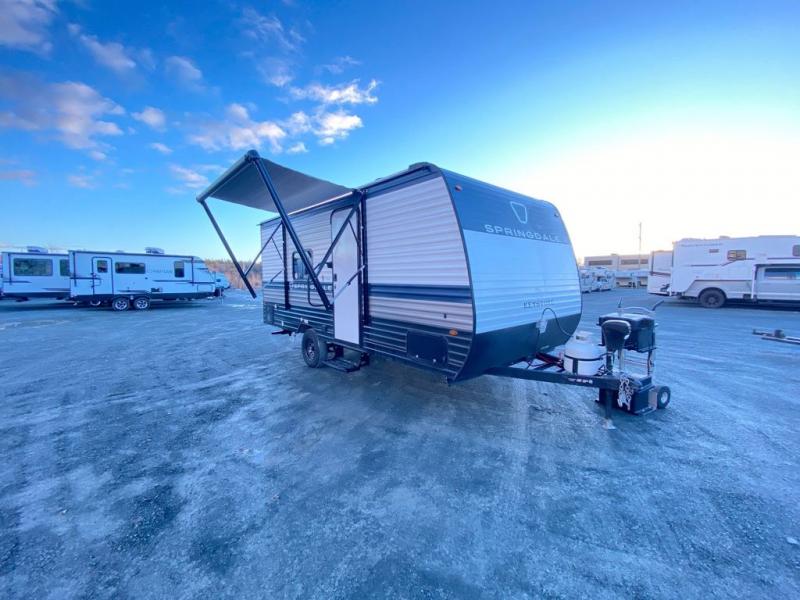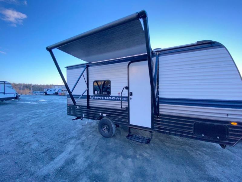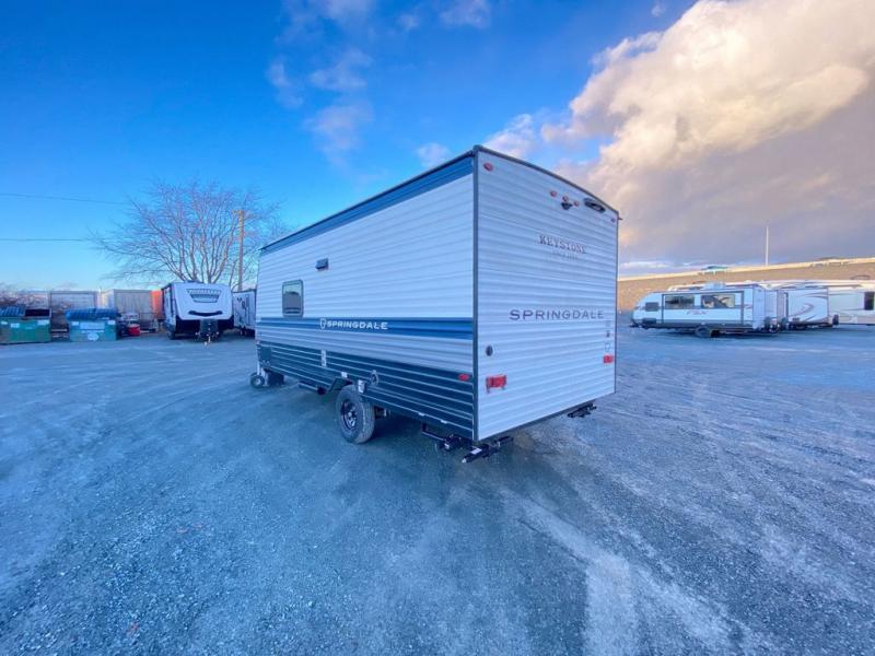 With any Springdale Mini travel trailer by Keystone, you will enjoy lightweight towing thanks to their single axle! The XL tinted safety glass windows are ultra durable, and the power awning will provide protection from the sun as you relax in your camp chairs outside. Each model includes blackout night shades, LED lighting, plus many more interior comforts. There is also a 20K BTU furnace to keep you comfortable, plus a tankless water heater for endless hot showers!