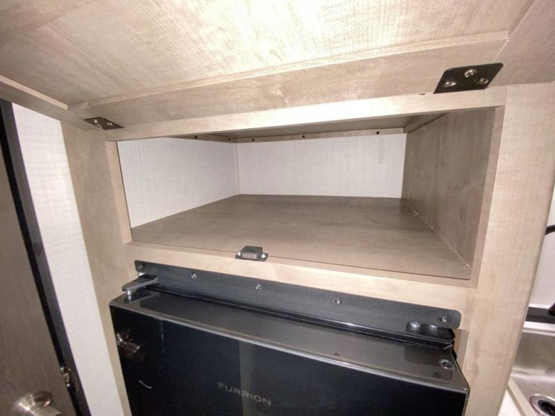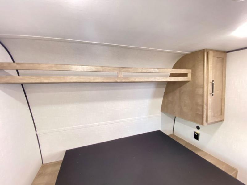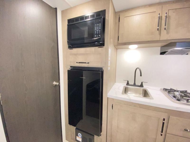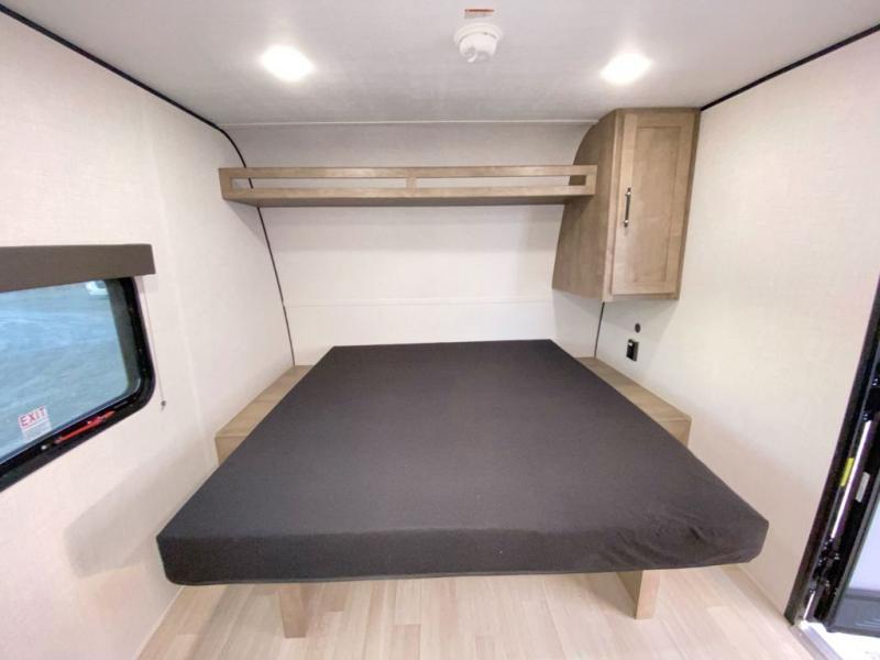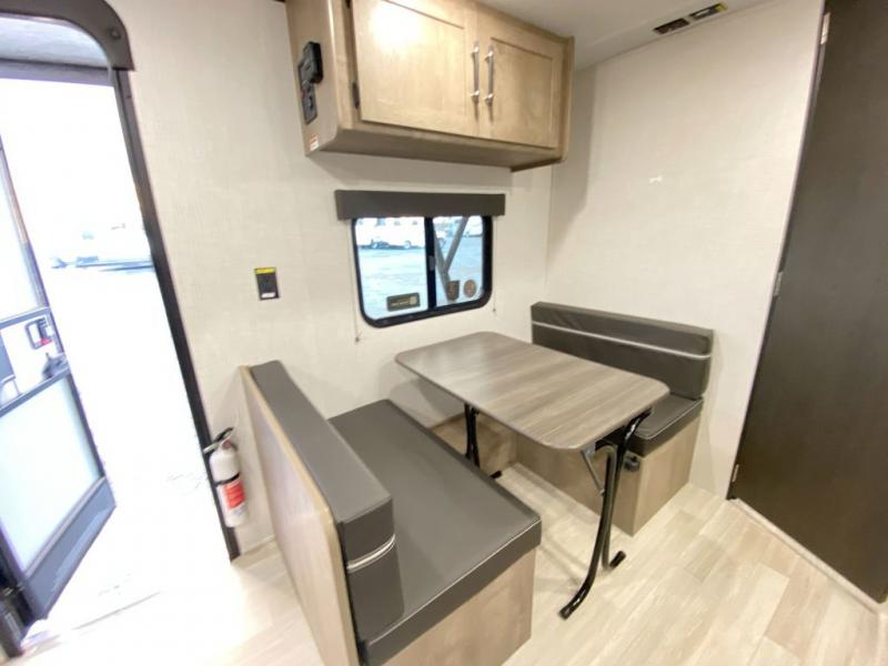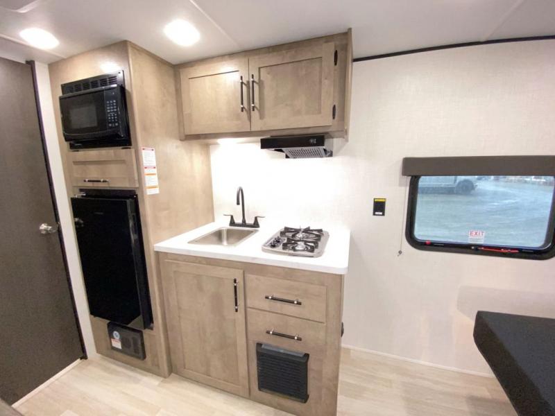 Camping trips just got easier travel trailer that can sleep three to four each night! There is a front Olympic RV queen bed with an overhead shelf and bedside wardrobe for your things. A two-burner cooktop and microwave oven will let you make breakfast for your crew, and a booth dinette provides a place to dine together, as well as convert to sleeping space for a guest or two little ones. This travel trailer also includes a full rear bath, complete with a shower, toilet, and vanity with a sink and overhead cabinet!
