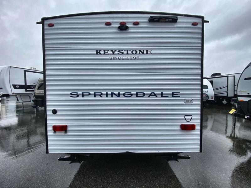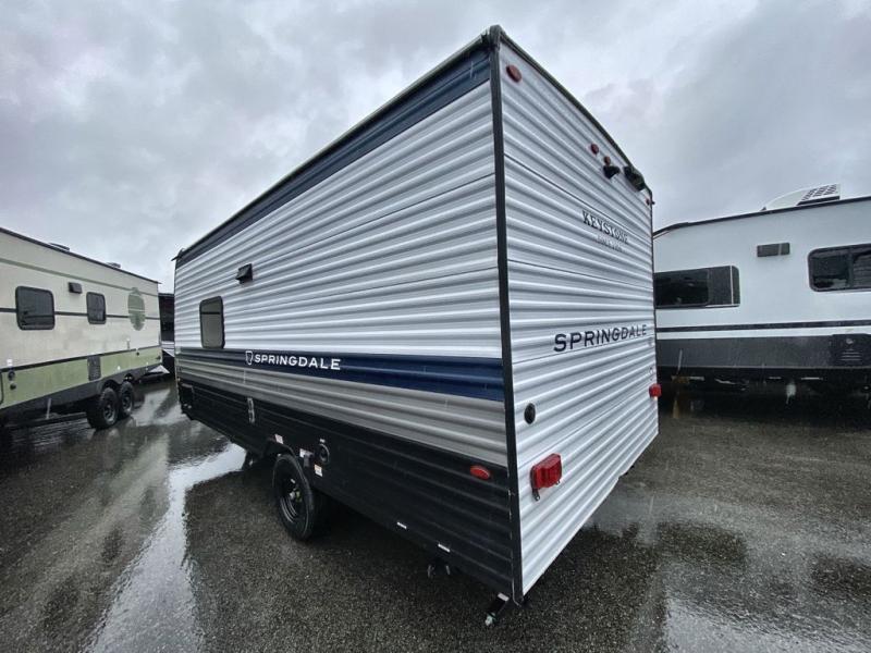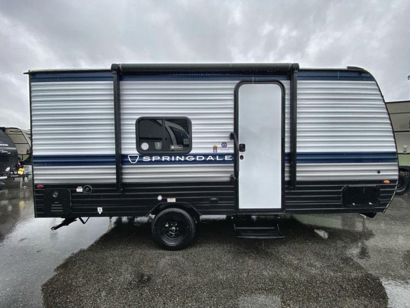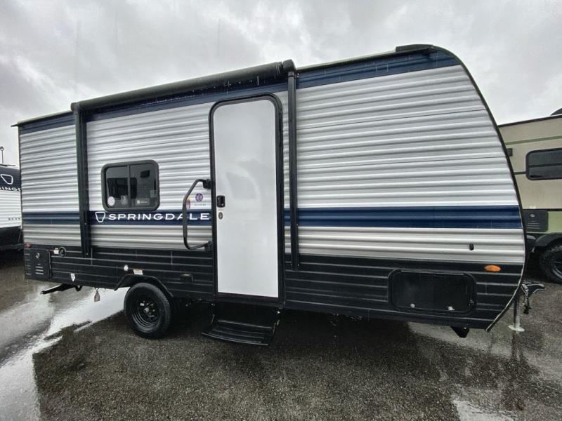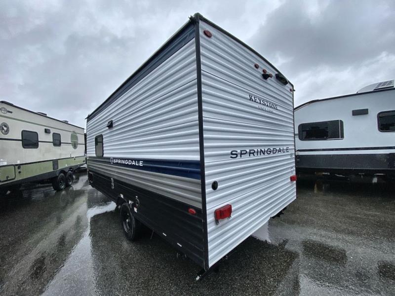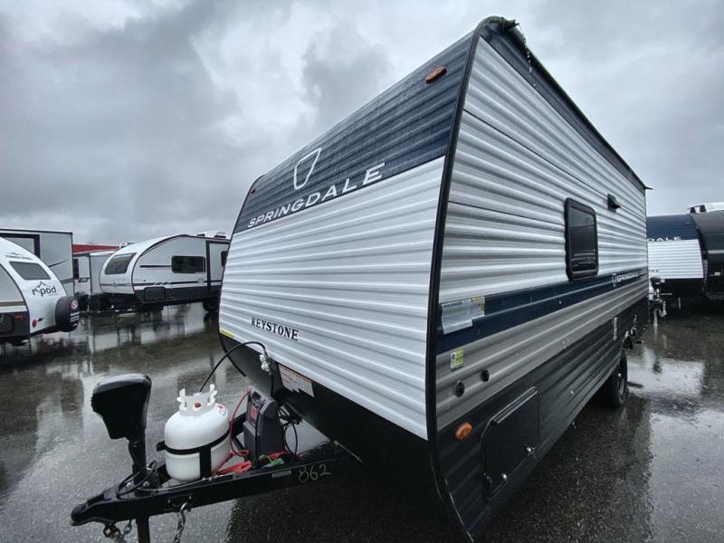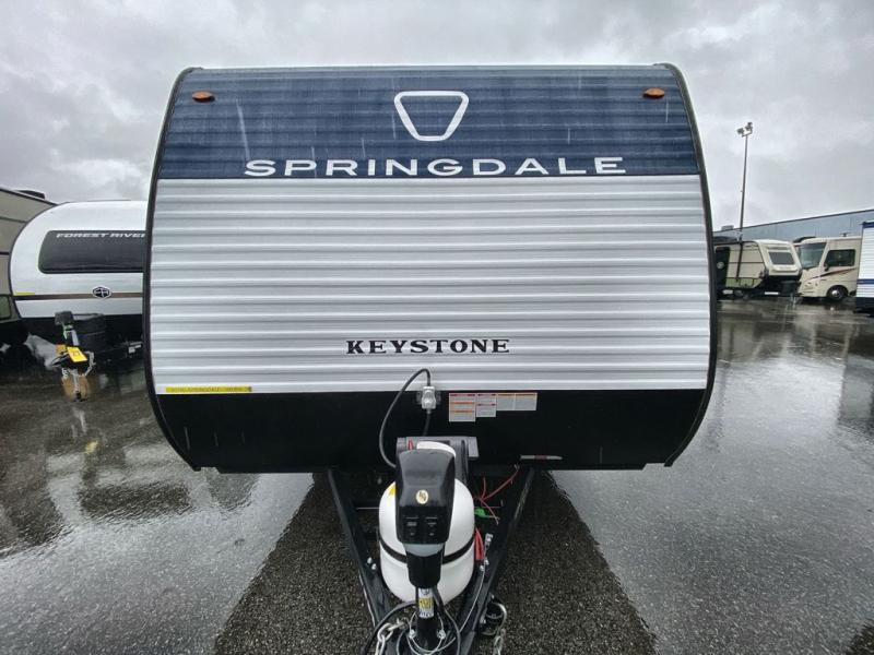 With any Springdale Mini travel trailer by Keystone, you will enjoy lightweight towing thanks to their single axle! The XL tinted safety glass windows are ultra durable, and the power awning will provide protection from the sun as you relax in your camp chairs outside. Each model includes blackout night shades, LED lighting, plus many more interior comforts. There is also a 20K BTU furnace to keep you comfortable, plus a tankless water heater for endless hot showers!