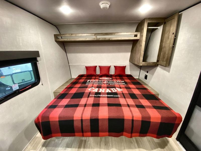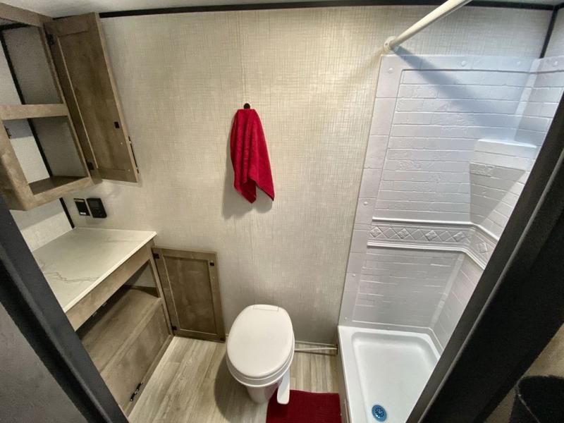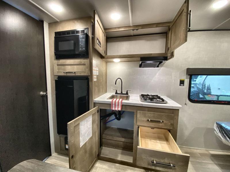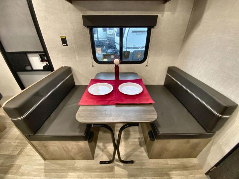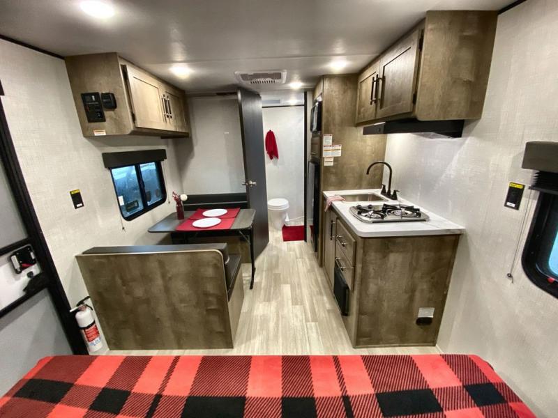 Camping trips just got easier travel trailer that can sleep three to four each night! There is a front Olympic RV queen bed with an overhead shelf and bedside wardrobe for your things. A two-burner cooktop and microwave oven will let you make breakfast for your crew, and a booth dinette provides a place to dine together, as well as convert to sleeping space for a guest or two little ones. This travel trailer also includes a full rear bath, complete with a shower, toilet, and vanity with a sink and overhead cabinet!
