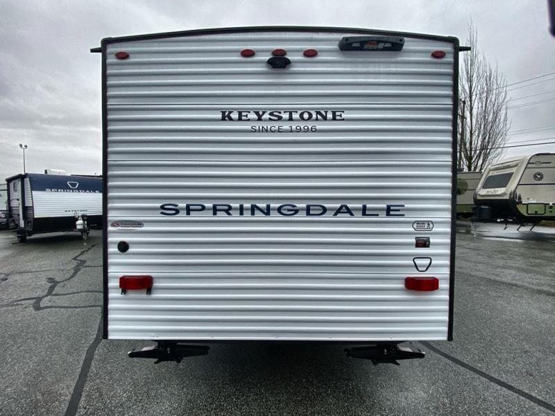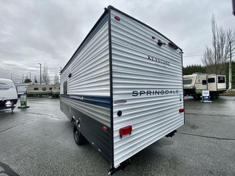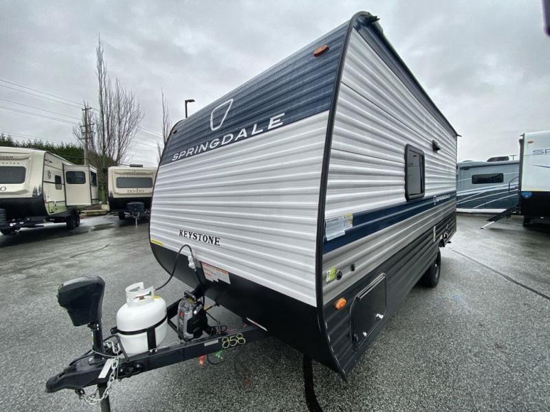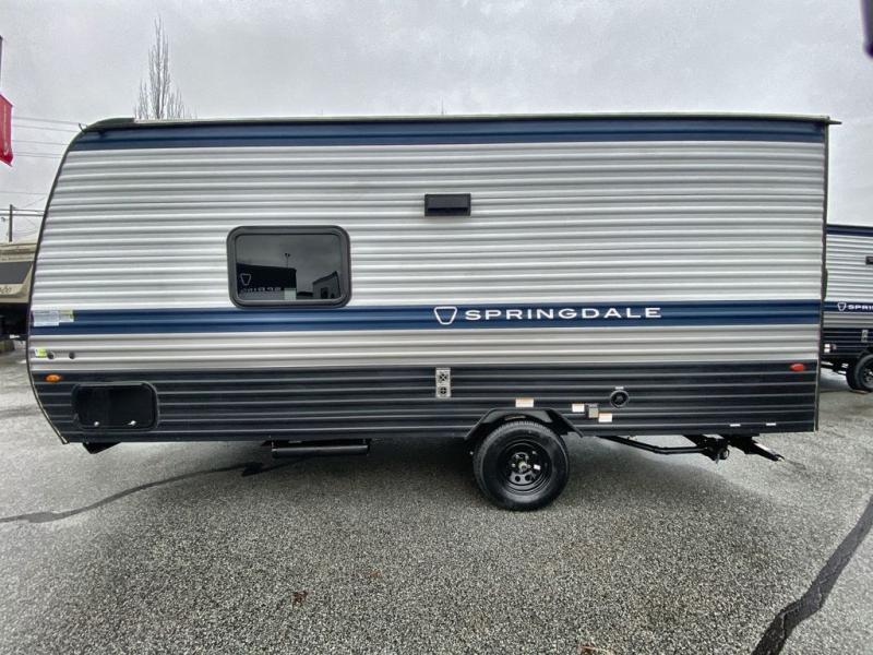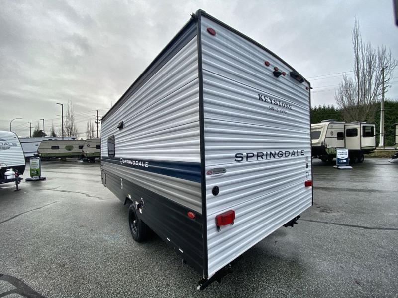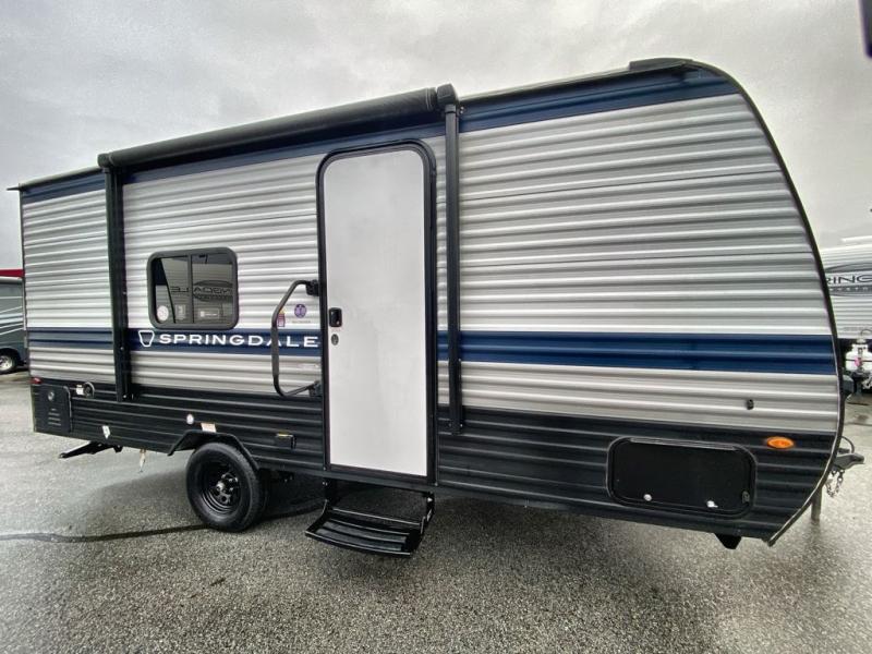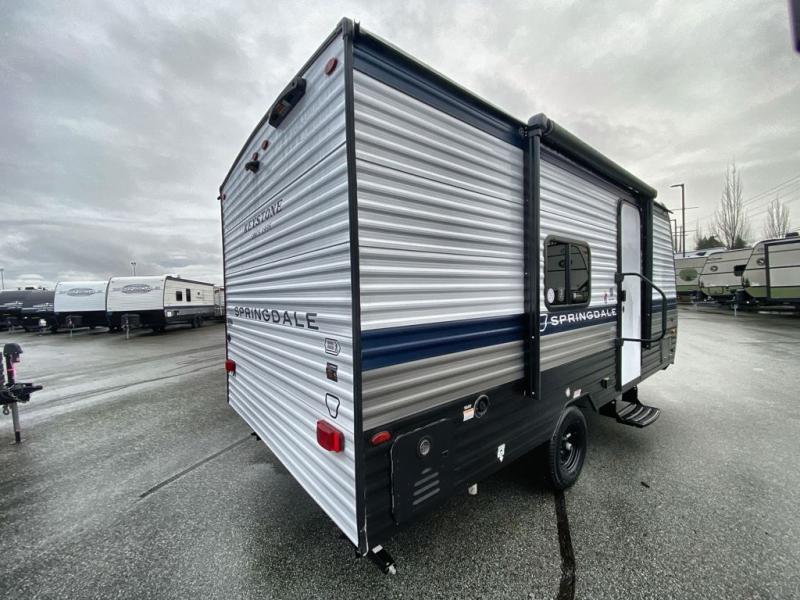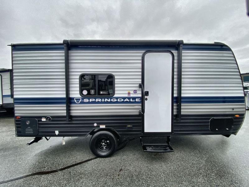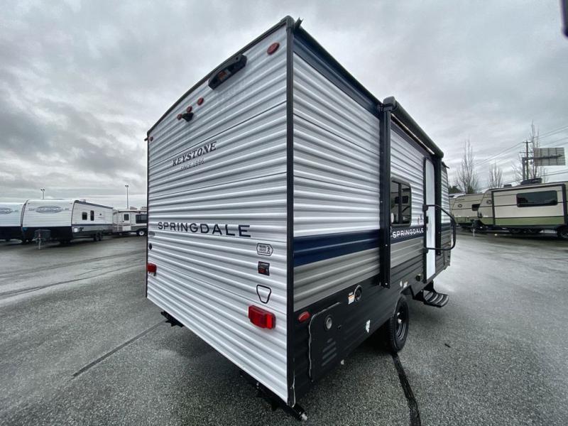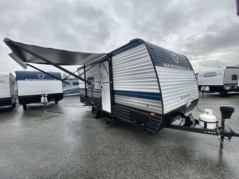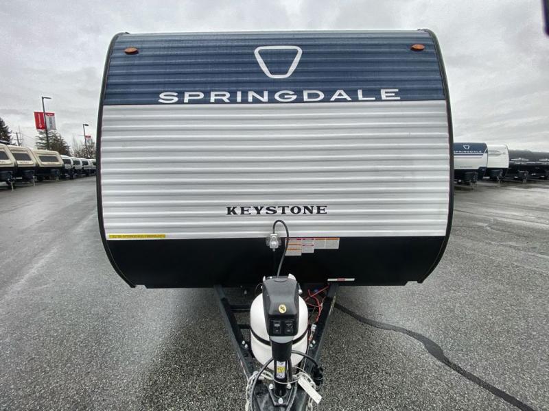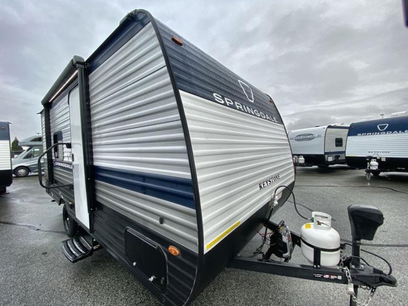 With any Springdale Mini travel trailer by Keystone, you will enjoy lightweight towing thanks to their single axle! The XL tinted safety glass windows are ultra durable, and the power awning will provide protection from the sun as you relax in your camp chairs outside. Each model includes blackout night shades, LED lighting, plus many more interior comforts. There is also a 20K BTU furnace to keep you comfortable, plus a tankless water heater for endless hot showers!