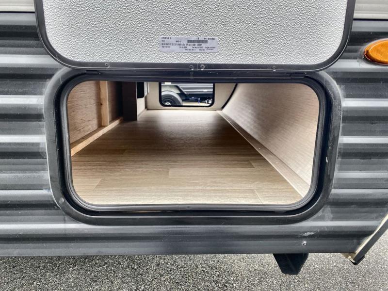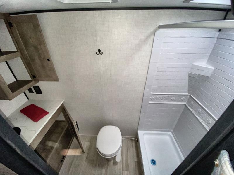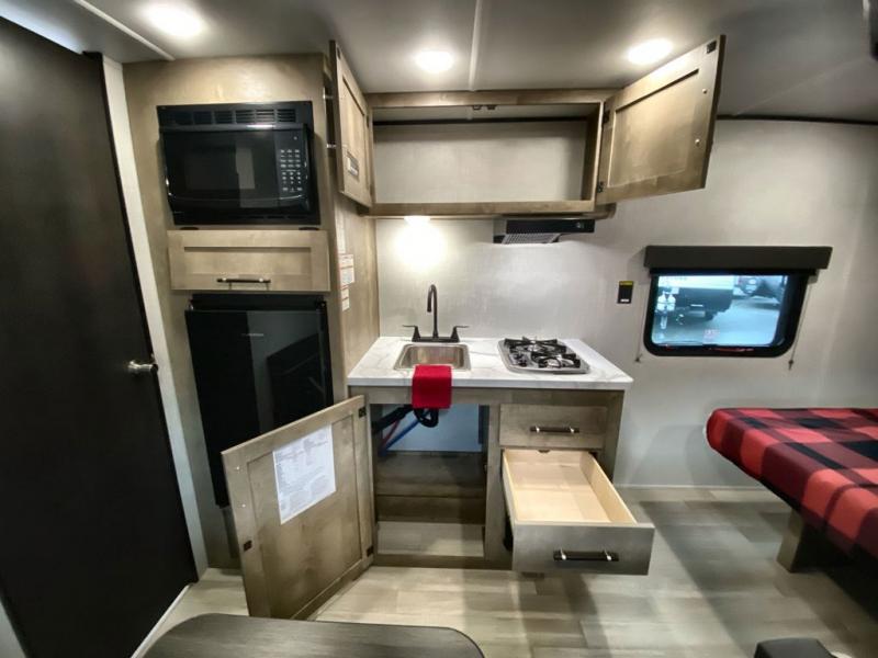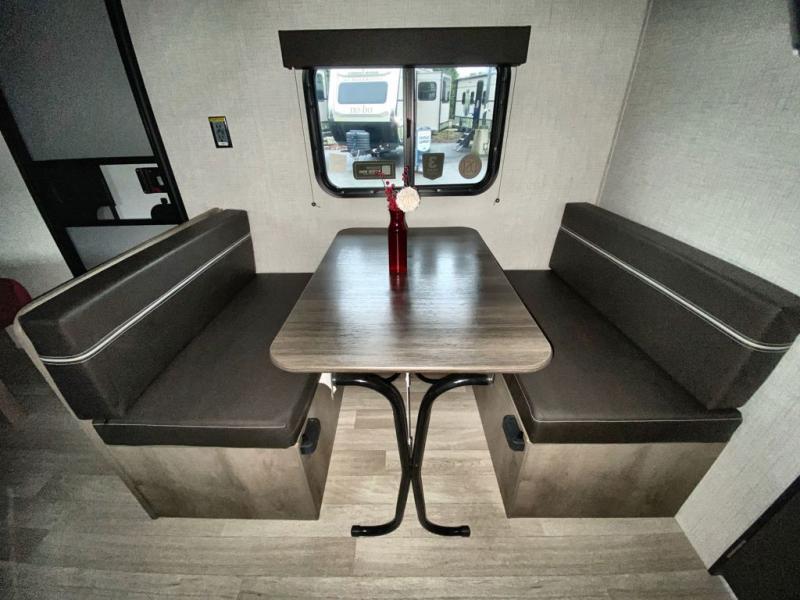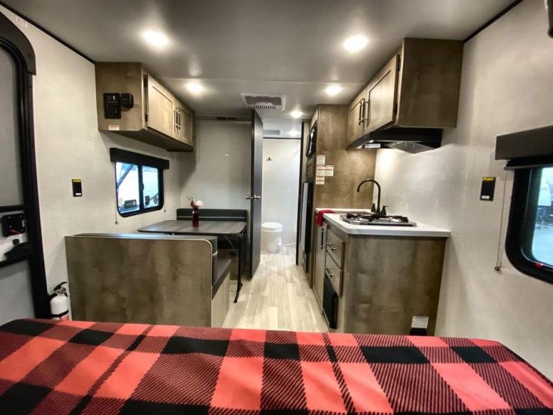 Camping trips just got easier travel trailer that can sleep three to four each night! There is a front Olympic RV queen bed with an overhead shelf and bedside wardrobe for your things. A two-burner cooktop and microwave oven will let you make breakfast for your crew, and a booth dinette provides a place to dine together, as well as convert to sleeping space for a guest or two little ones. This travel trailer also includes a full rear bath, complete with a shower, toilet, and vanity with a sink and overhead cabinet!
