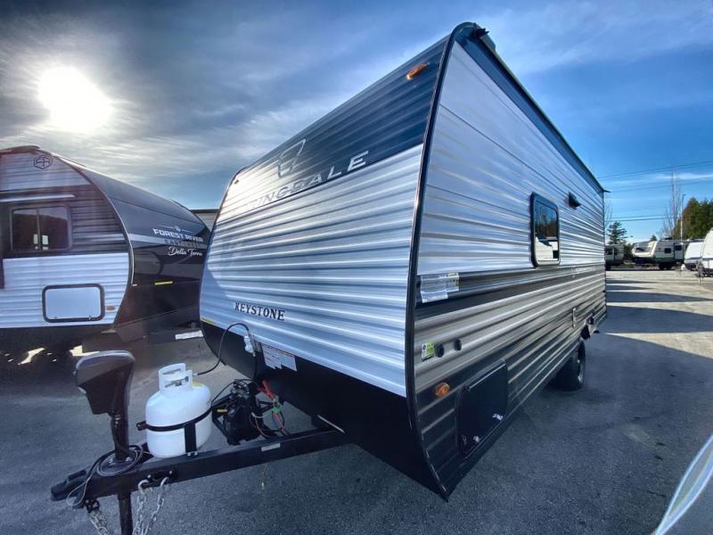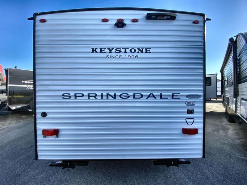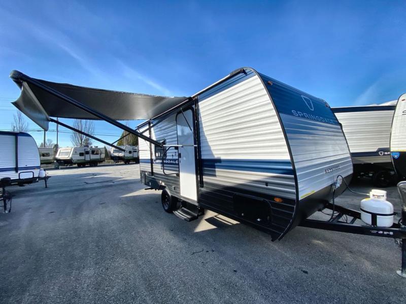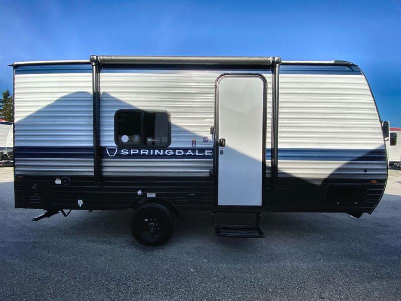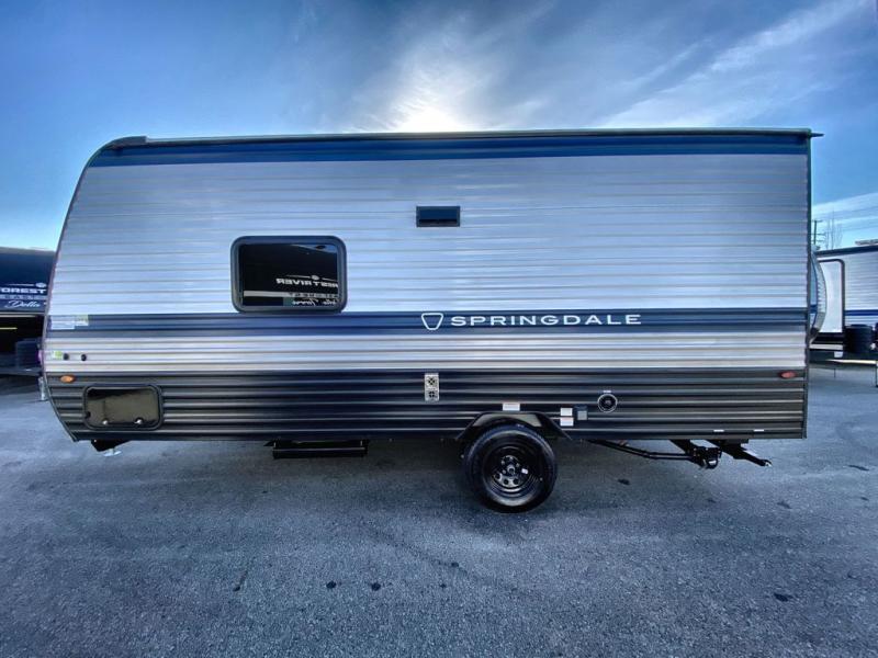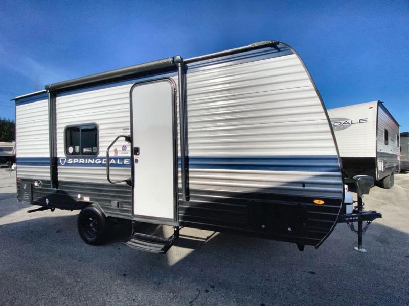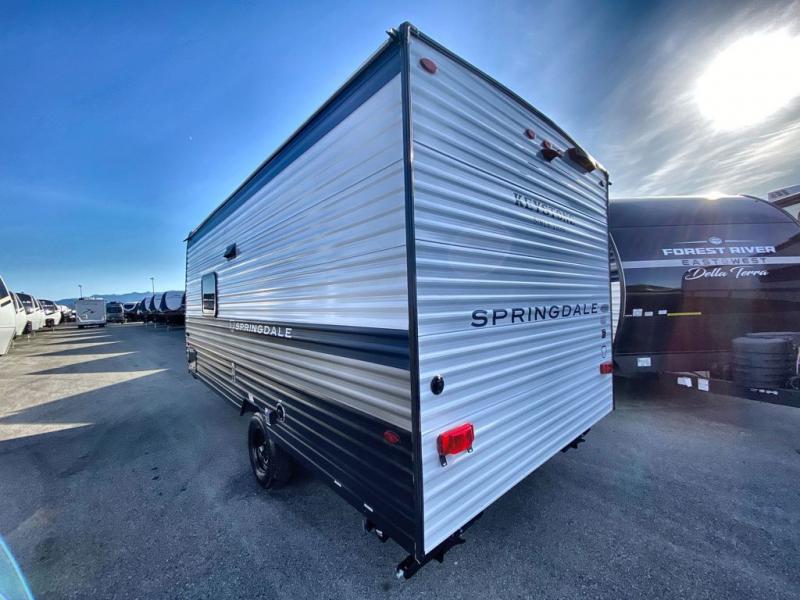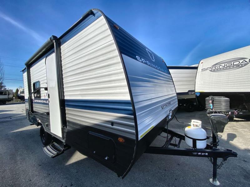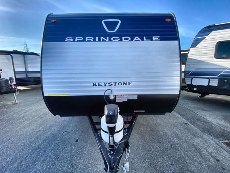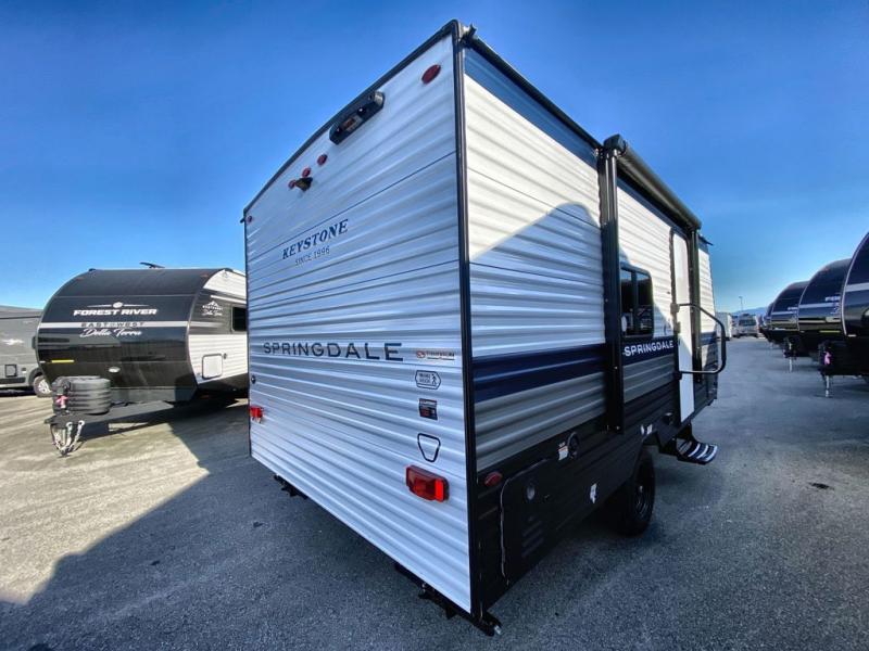 With any Springdale Mini travel trailer by Keystone, you will enjoy lightweight towing thanks to their single axle! The XL tinted safety glass windows are ultra durable, and the power awning will provide protection from the sun as you relax in your camp chairs outside. Each model includes blackout night shades, LED lighting, plus many more interior comforts. There is also a 20K BTU furnace to keep you comfortable, plus a tankless water heater for endless hot showers!