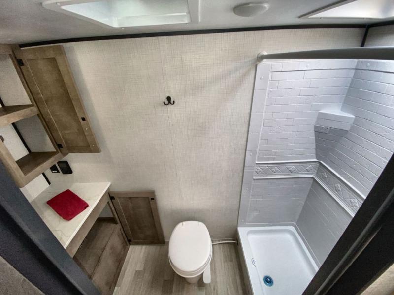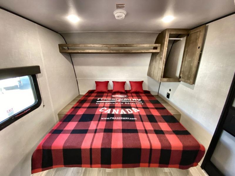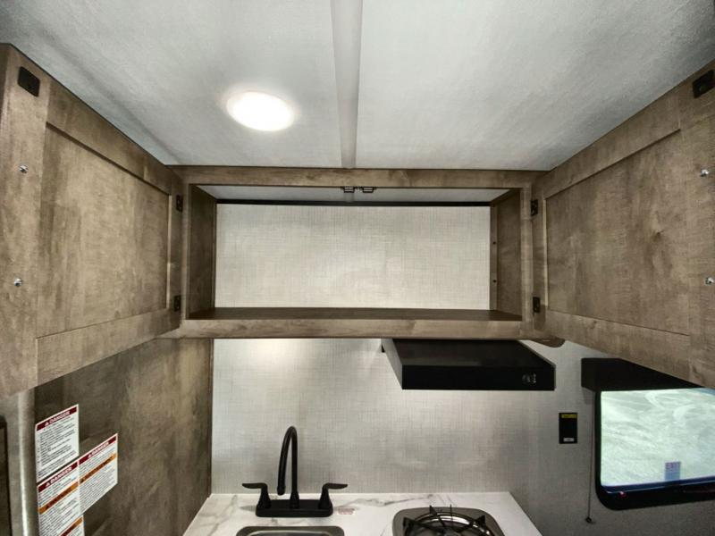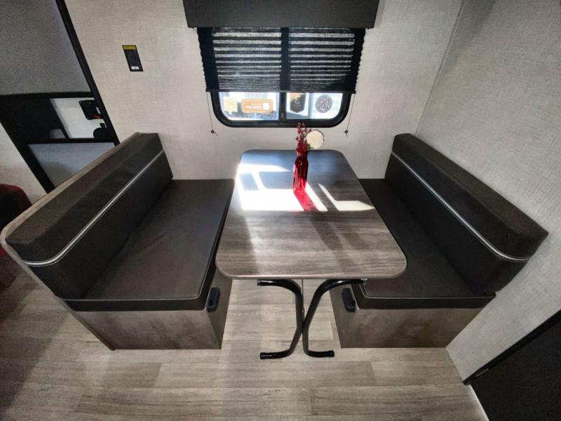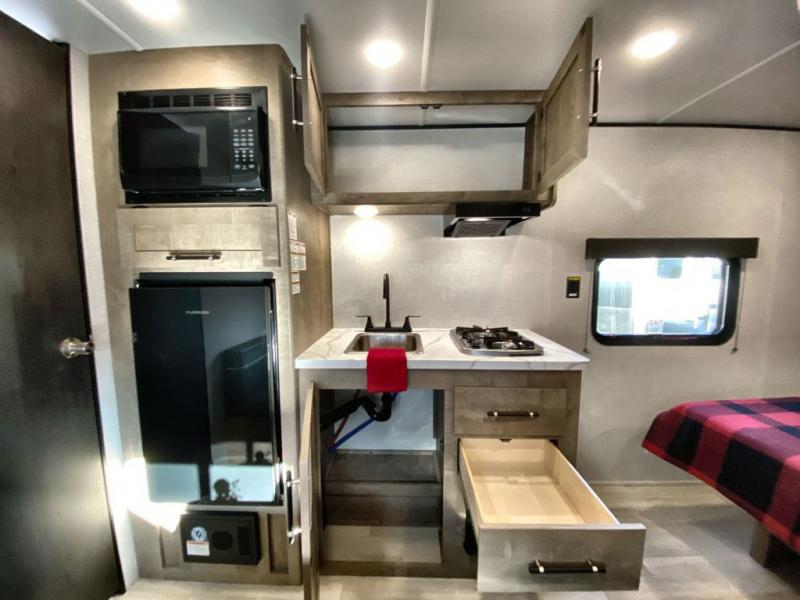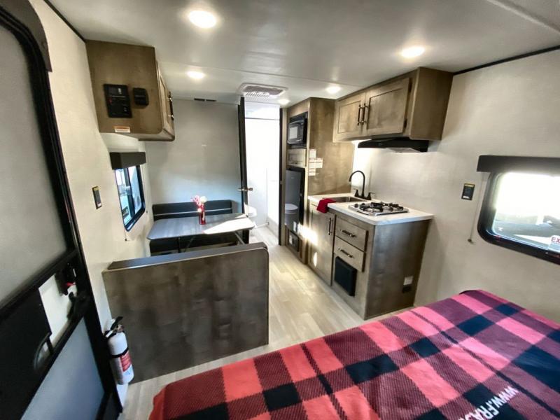 Camping trips just got easier travel trailer that can sleep three to four each night! There is a front Olympic RV queen bed with an overhead shelf and bedside wardrobe for your things. A two-burner cooktop and microwave oven will let you make breakfast for your crew, and a booth dinette provides a place to dine together, as well as convert to sleeping space for a guest or two little ones. This travel trailer also includes a full rear bath, complete with a shower, toilet, and vanity with a sink and overhead cabinet!