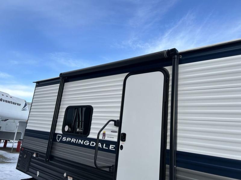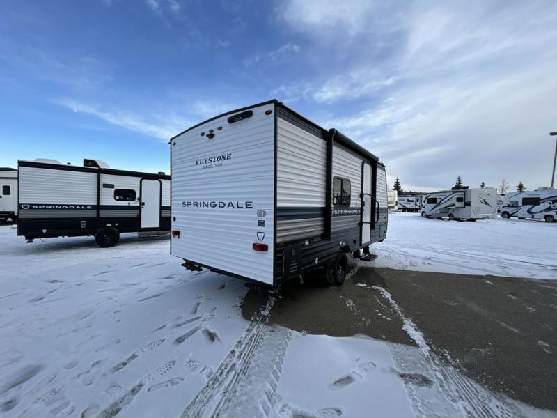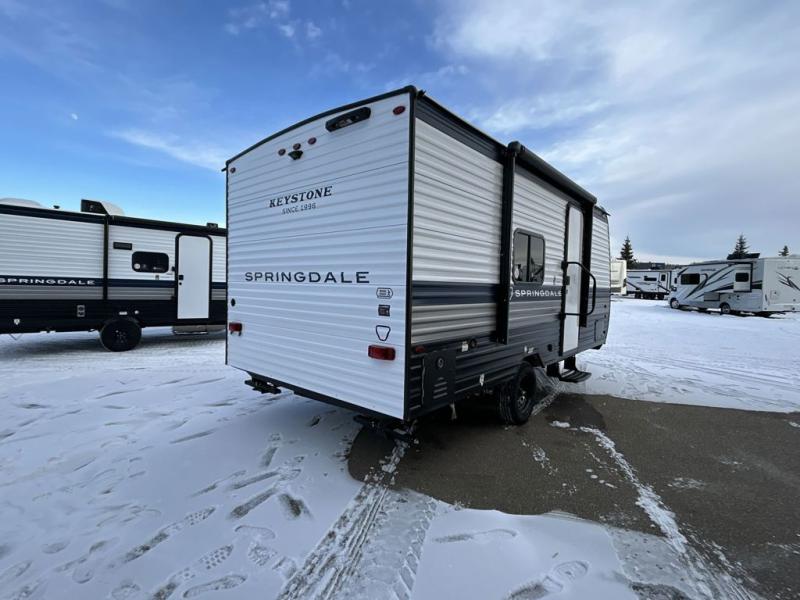 With any Springdale Mini travel trailer by Keystone, you will enjoy lightweight towing thanks to their single axle! The XL tinted safety glass windows are ultra durable, and the power awning will provide protection from the sun as you relax in your camp chairs outside. Each model includes blackout night shades, LED lighting, plus many more interior comforts. There is also a 20K BTU furnace to keep you comfortable, plus a tankless water heater for endless hot showers!