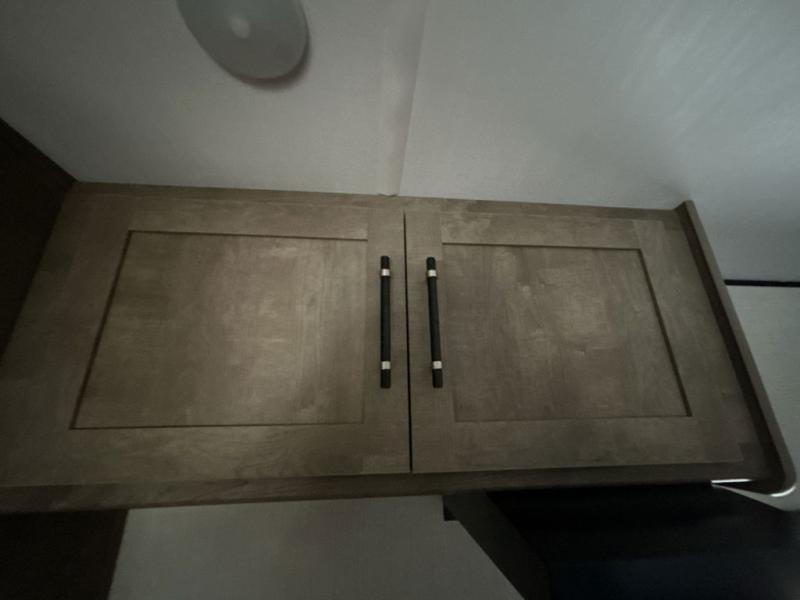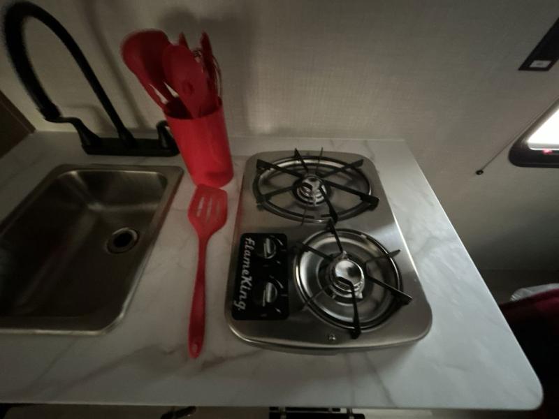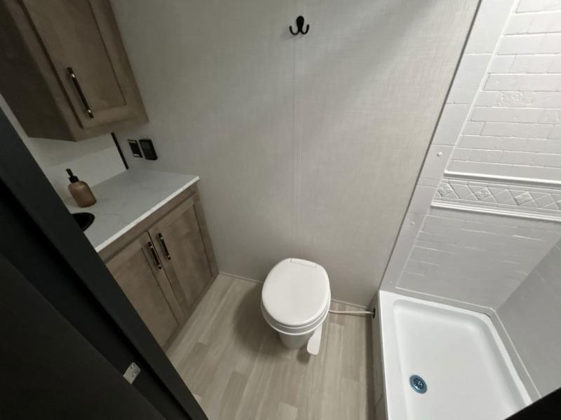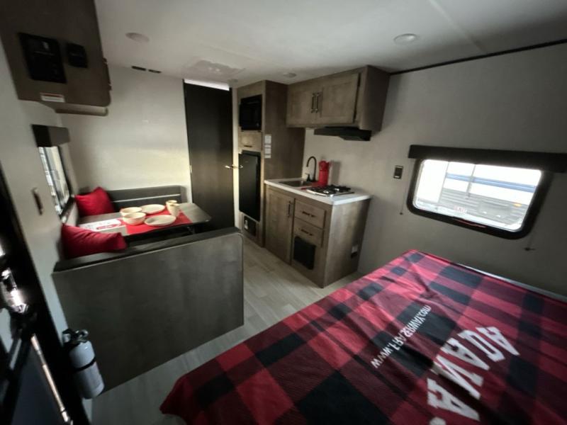 Camping trips just got easier travel trailer that can sleep three to four each night! There is a front Olympic RV queen bed with an overhead shelf and bedside wardrobe for your things. A two-burner cooktop and microwave oven will let you make breakfast for your crew, and a booth dinette provides a place to dine together, as well as convert to sleeping space for a guest or two little ones. This travel trailer also includes a full rear bath, complete with a shower, toilet, and vanity with a sink and overhead cabinet!