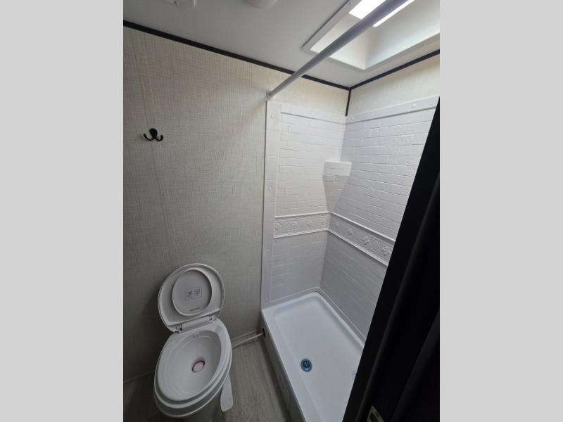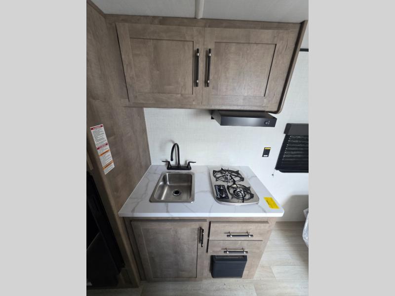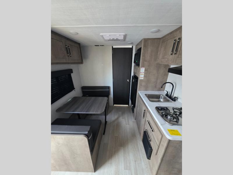 Camping trips just got easier travel trailer that can sleep three to four each night! There is a front Olympic RV queen bed with an overhead shelf and bedside wardrobe for your things. A two-burner cooktop and microwave oven will let you make breakfast for your crew, and a booth dinette provides a place to dine together, as well as convert to sleeping space for a guest or two little ones. This travel trailer also includes a full rear bath, complete with a shower, toilet, and vanity with a sink and overhead cabinet!