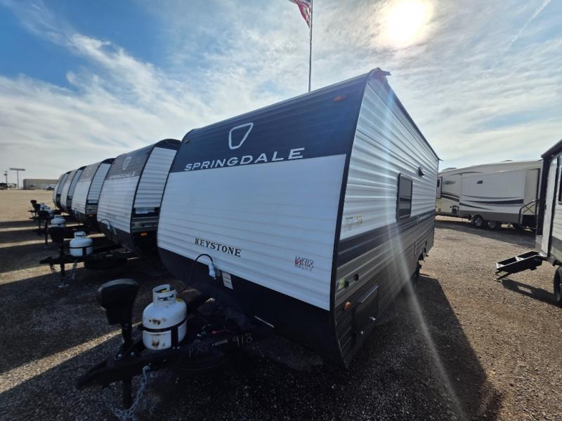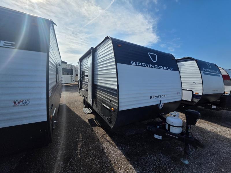 With any Springdale Mini travel trailer by Keystone, you will enjoy lightweight towing thanks to their single axle! The XL tinted safety glass windows are ultra durable, and the power awning will provide protection from the sun as you relax in your camp chairs outside. Each model includes blackout night shades, LED lighting, plus many more interior comforts. There is also a 20K BTU furnace to keep you comfortable, plus a tankless water heater for endless hot showers!