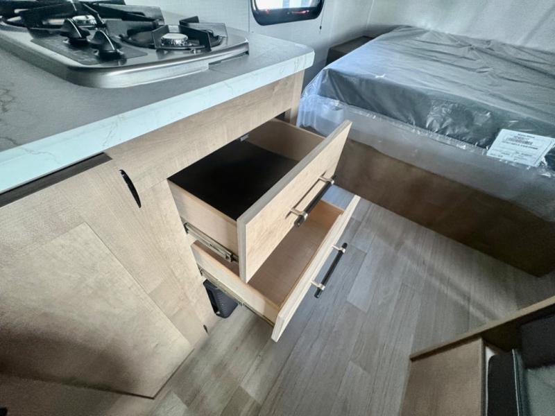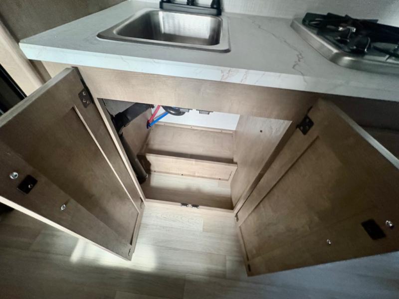 Smart, Space-Saving Floorplan – Despite its smaller footprint, this travel trailer makes smart use of every inch. The open layout provides comfortable living space, a fully equipped kitchen, a private bedroom, and a full bathroom — everything you need for camping comfort on the go.