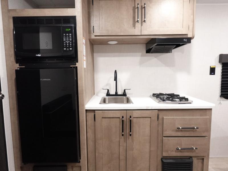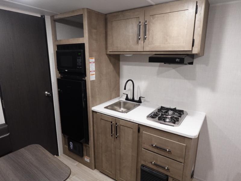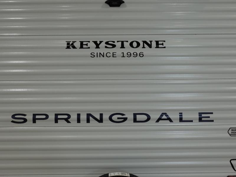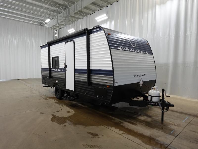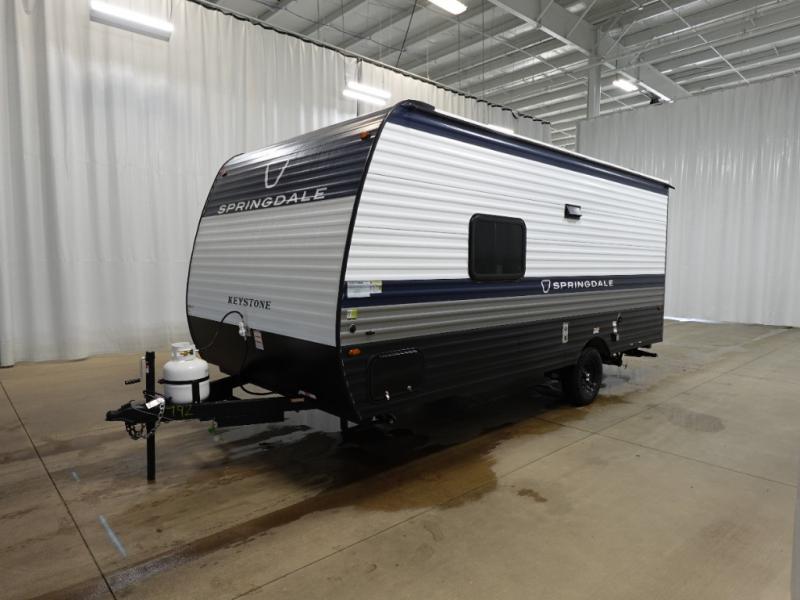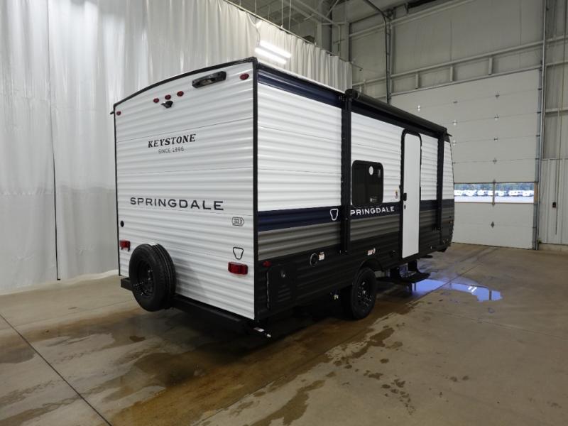 With any Springdale Mini travel trailer by Keystone, you will enjoy lightweight towing thanks to their single-axle! The AlphaPly TPO roof membrane is ultra durable, and the power awning will provide protection from the sun as you relax in your camp chairs outside. Each model includes blackout night shades, LED lighting, plus many more interior comforts. There is also a roof A/C and 20K BTU furnace to keep you comfortable, plus a tankless water heater for endless hot showers!