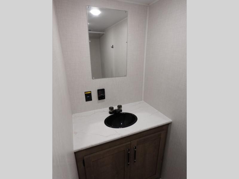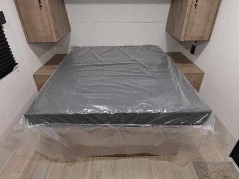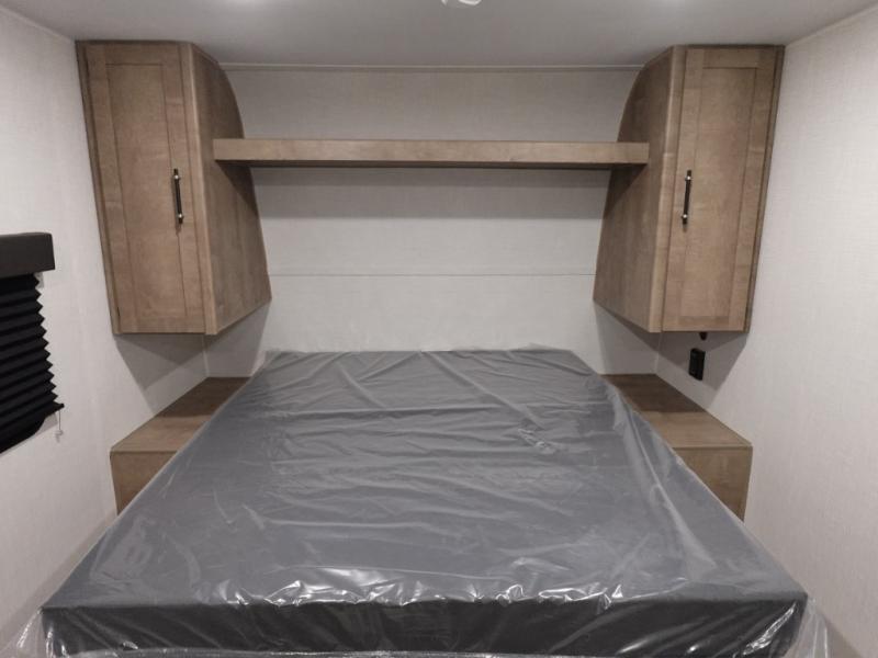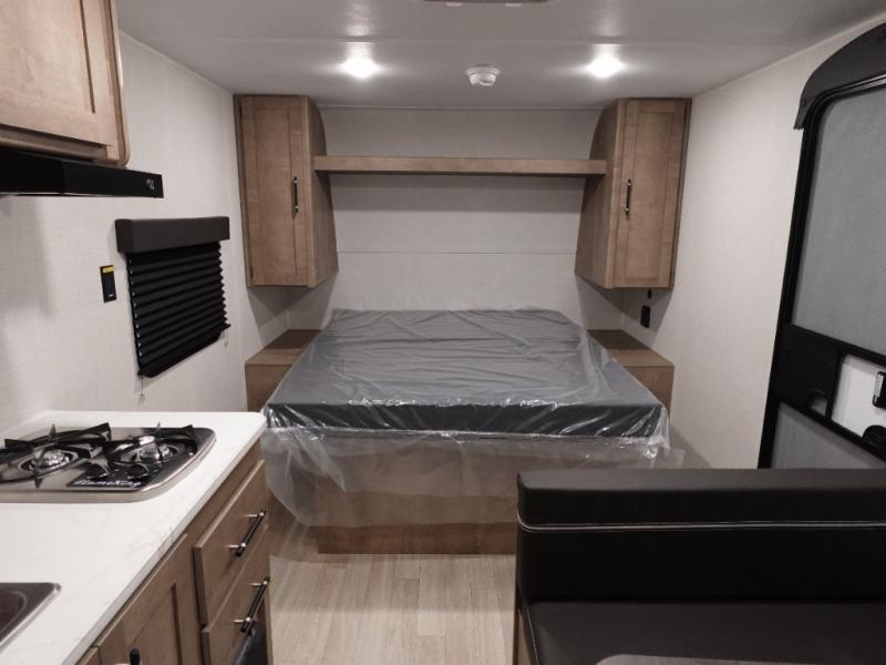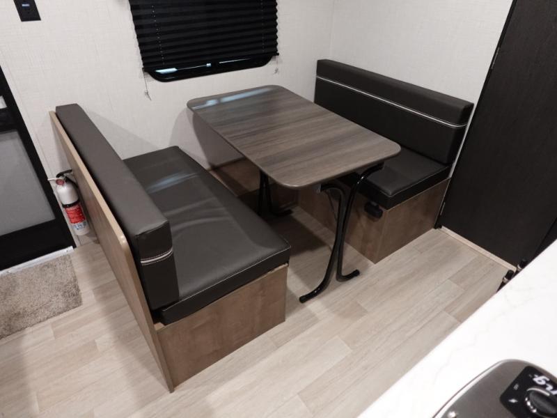 This cozy trailer for two or four will have you out enjoying nature easily. There is a queen bed for you, and the booth dinette can easily transform into a bed for one or two more campers if needed at night. The rear private bath features a shower and vanity with sink, plus toilet so no late night trips to the campground bathroom. There is ample storage in overhead cabinets on both sides of the trailer, as well as dual closets and nightstands on either side of the bed. A 10' awning offers even more living space outside. Grab a couple of camp chairs and enjoy hanging out with your campground neighbors or enjoying a campfire.