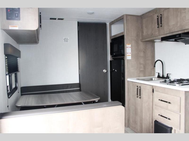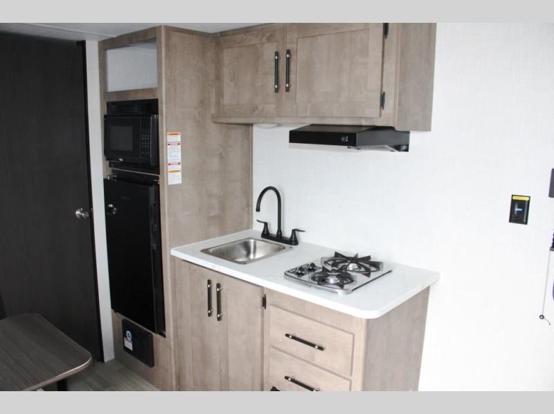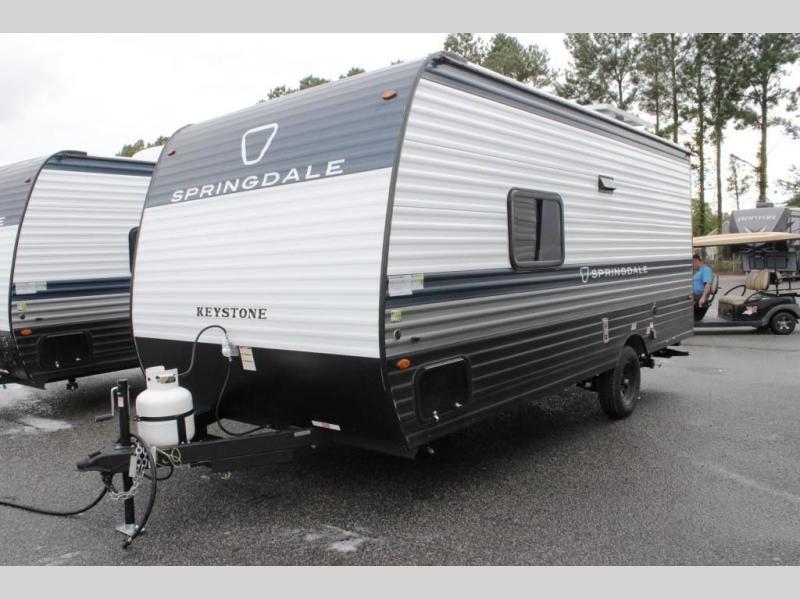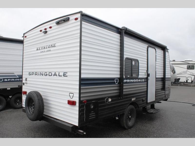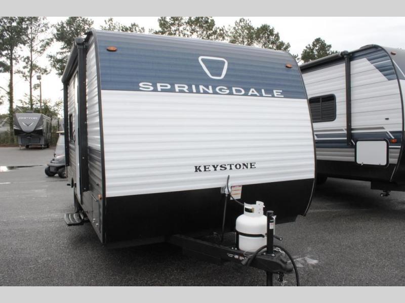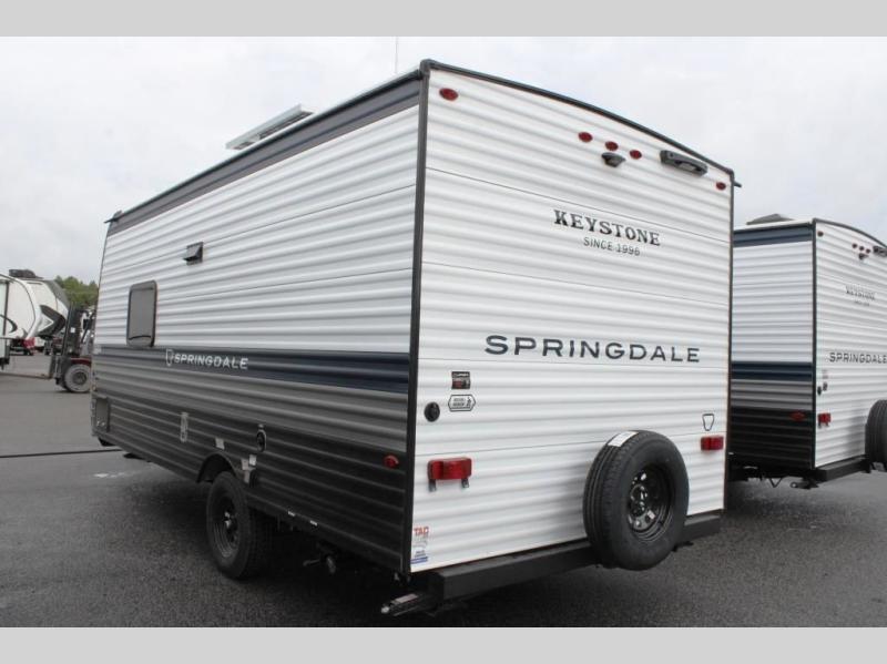With any Springdale Mini travel trailer by Keystone, you will enjoy lightweight towing thanks to their single-axle! The AlphaPly TPO roof membrane is ultra durable, and the power awning will provide protection from the sun as you relax in your camp chairs outside. Each model includes blackout night shades, LED lighting, plus many more interior comforts. There is also a roof A/C and 20K BTU furnace to keep you comfortable, plus a tankless water heater for endless hot showers!