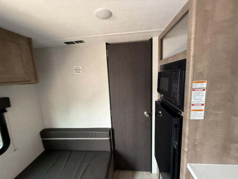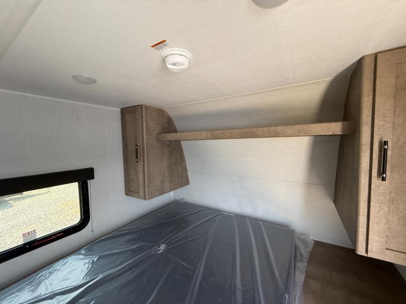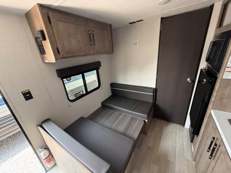 This cozy trailer for two or four will have you out enjoying nature easily. There is a queen bed for you, and the booth dinette can easily transform into a bed for one or two more campers if needed at night. The rear private bath features a shower and vanity with sink, plus toilet so no late night trips to the campground bathroom. There is ample storage in overhead cabinets on both sides of the trailer, as well as dual closets and nightstands on either side of the bed. A 10' awning offers even more living space outside. Grab a couple of camp chairs and enjoy hanging out with your campground neighbors or enjoying a campfire.