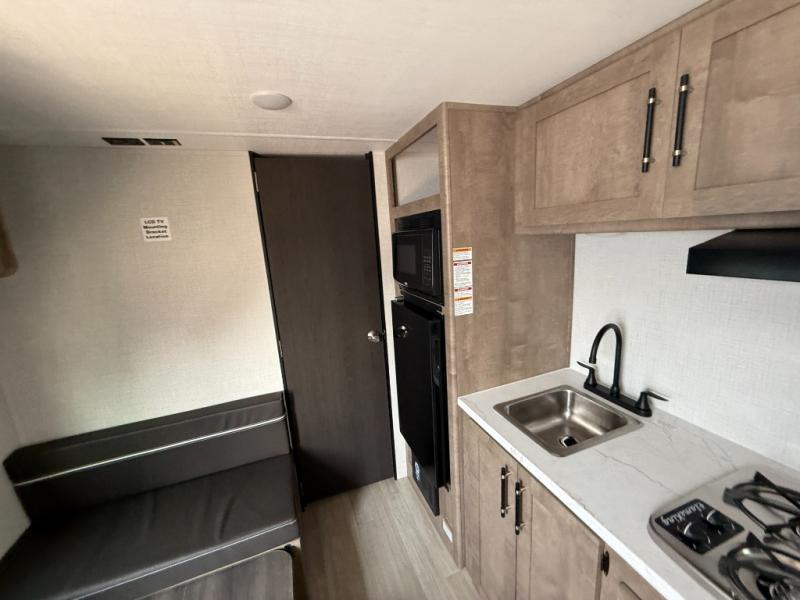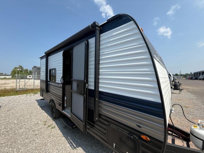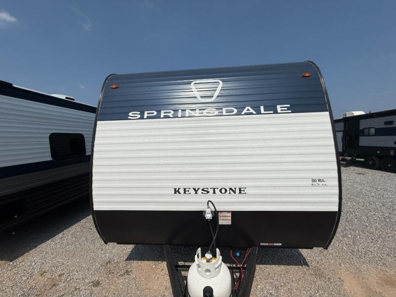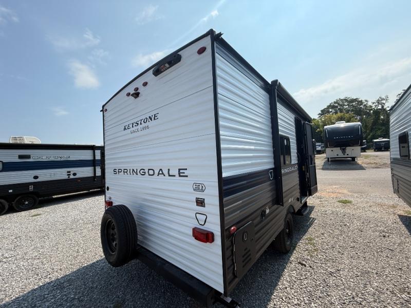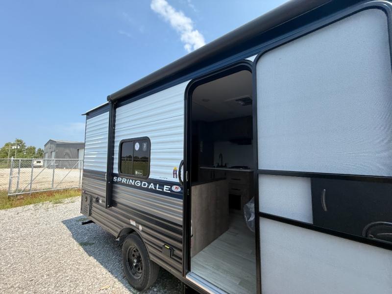 With any Springdale Mini travel trailer by Keystone, you will enjoy lightweight towing thanks to their single-axle! The AlphaPly TPO roof membrane is ultra durable, and the power awning will provide protection from the sun as you relax in your camp chairs outside. Each model includes blackout night shades, LED lighting, plus many more interior comforts. There is also a roof A/C and 20K BTU furnace to keep you comfortable, plus a tankless water heater for endless hot showers!