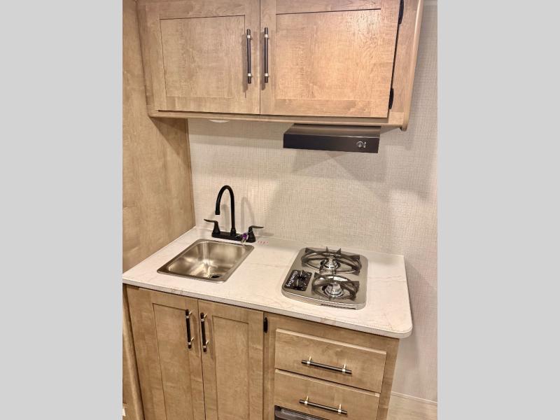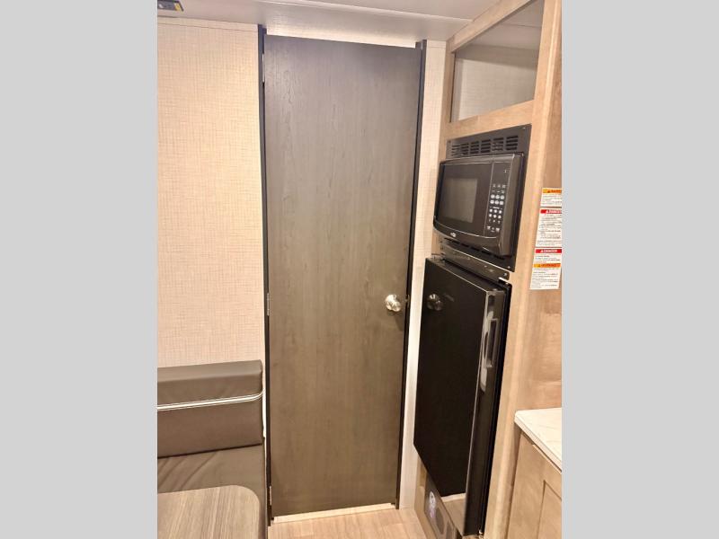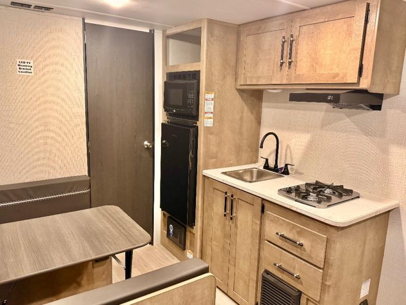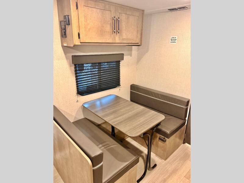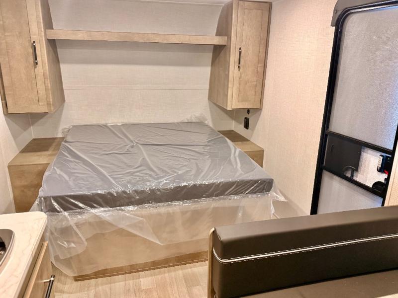 This cozy trailer for two or four will have you out enjoying nature easily. There is a queen bed for you, and the booth dinette can easily transform into a bed for one or two more campers if needed at night. The rear private bath features a shower and vanity with sink, plus toilet so no late night trips to the campground bathroom. There is ample storage in overhead cabinets on both sides of the trailer, as well as dual closets and nightstands on either side of the bed. A 10' awning offers even more living space outside. Grab a couple of camp chairs and enjoy hanging out with your campground neighbors or enjoying a campfire.