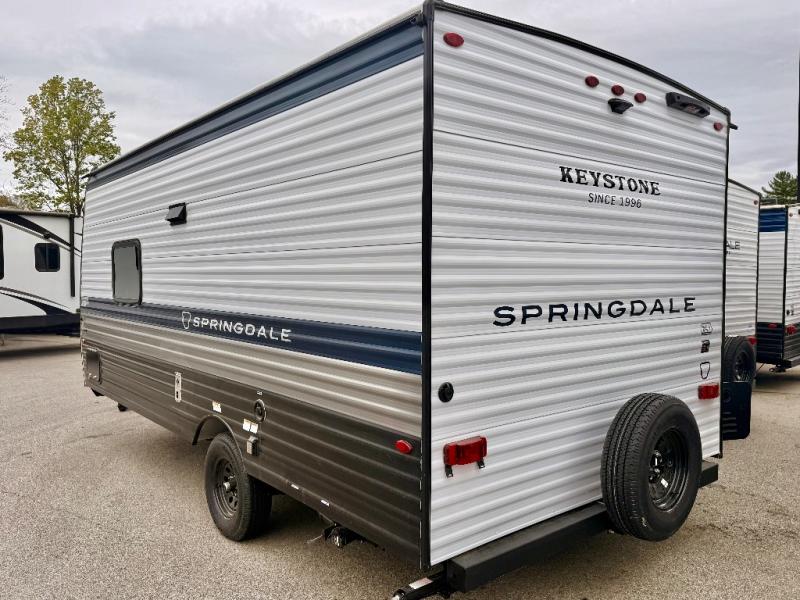 With any Springdale Mini travel trailer by Keystone, you will enjoy lightweight towing thanks to their single-axle! The AlphaPly TPO roof membrane is ultra durable, and the power awning will provide protection from the sun as you relax in your camp chairs outside. Each model includes blackout night shades, LED lighting, plus many more interior comforts. There is also a roof A/C and 20K BTU furnace to keep you comfortable, plus a tankless water heater for endless hot showers!