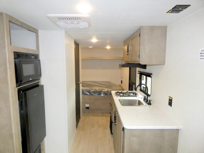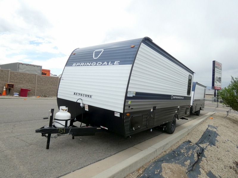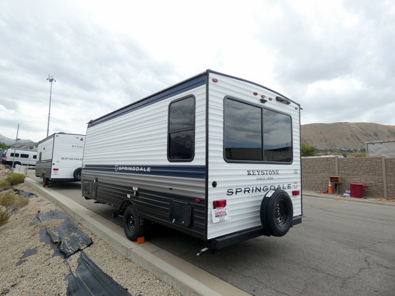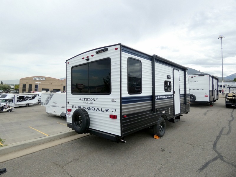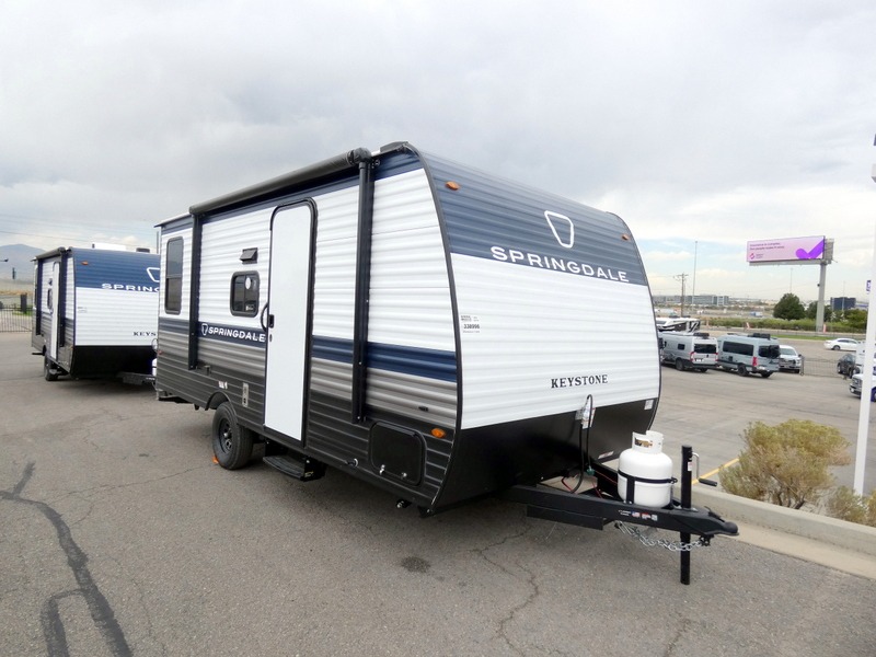 With any Springdale Mini travel trailer by Keystone, you will enjoy lightweight towing thanks to their single-axle! The AlphaPly TPO roof membrane is ultra durable, and the power awning will provide protection from the sun as you relax in your camp chairs outside. Each model includes blackout night shades, LED lighting, plus many more interior comforts. There is also a roof A/C and 20K BTU furnace to keep you comfortable, plus a tankless water heater for endless hot showers!