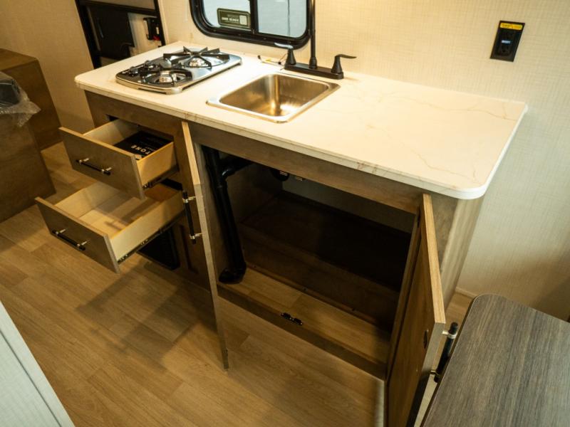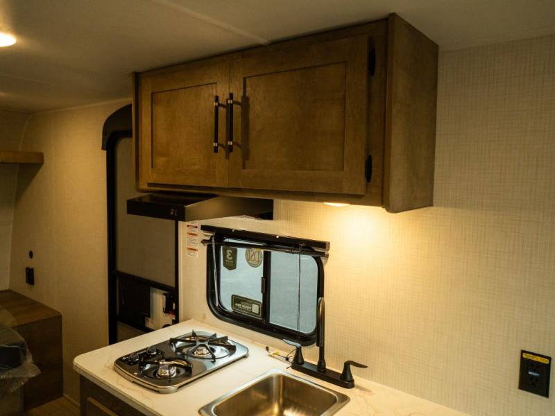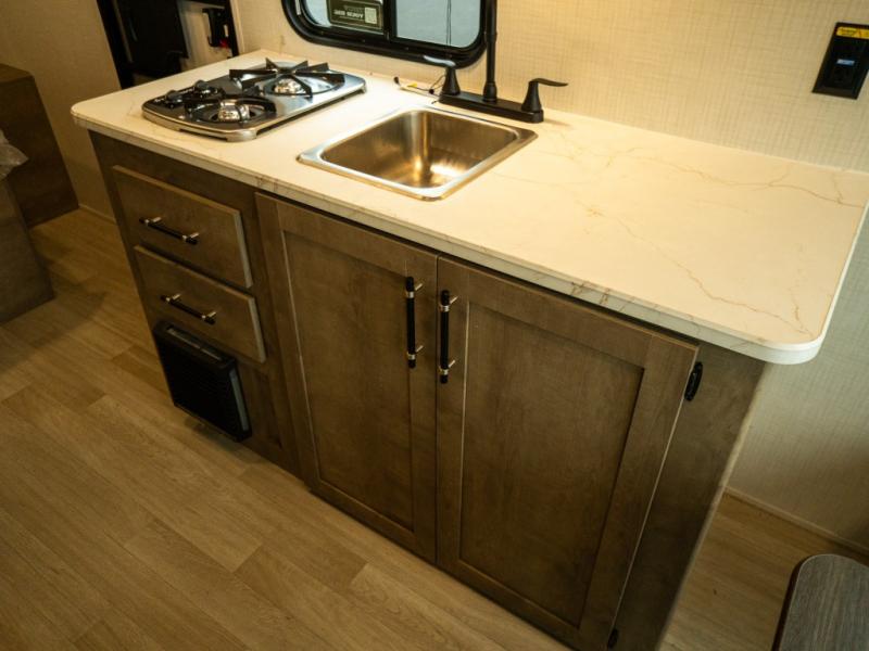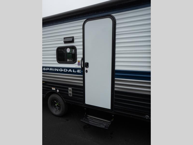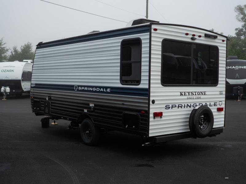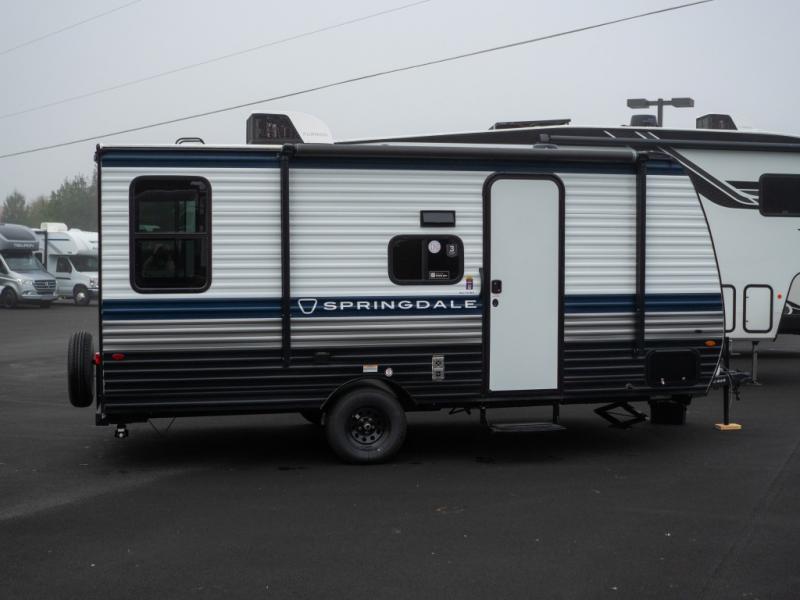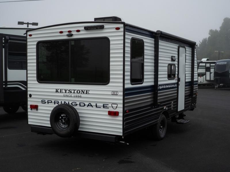 With any Springdale Mini travel trailer by Keystone, you will enjoy lightweight towing thanks to their single-axle! The AlphaPly TPO roof membrane is ultra durable, and the power awning will provide protection from the sun as you relax in your camp chairs outside. Each model includes blackout night shades, LED lighting, plus many more interior comforts. There is also a roof A/C and 20K BTU furnace to keep you comfortable, plus a tankless water heater for endless hot showers!