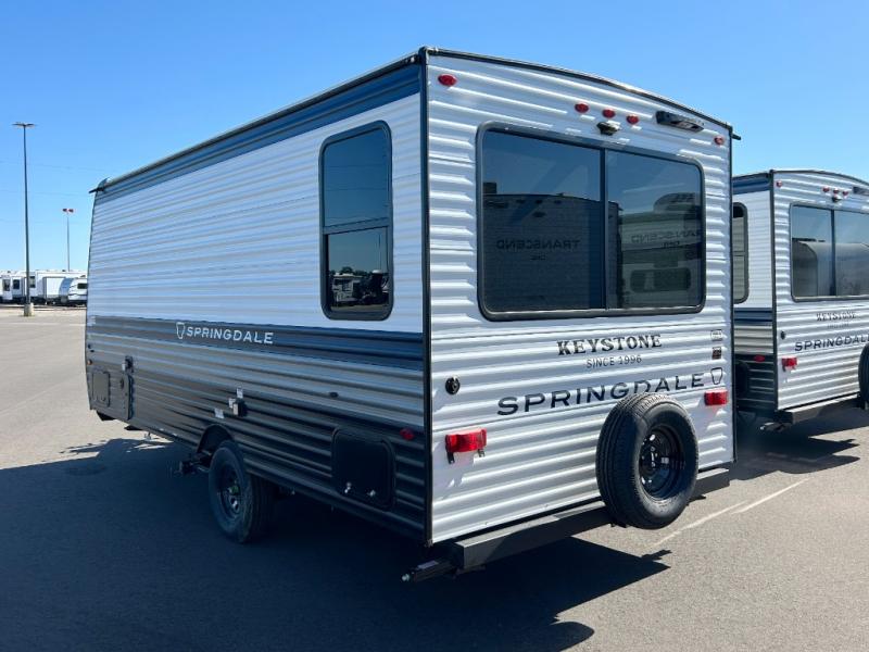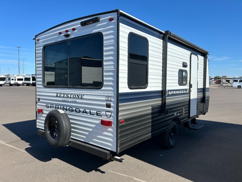 With any Springdale Mini travel trailer by Keystone, you will enjoy lightweight towing thanks to their single-axle! The AlphaPly TPO roof membrane is ultra durable, and the power awning will provide protection from the sun as you relax in your camp chairs outside. Each model includes blackout night shades, LED lighting, plus many more interior comforts. There is also a roof A/C and 20K BTU furnace to keep you comfortable, plus a tankless water heater for endless hot showers!