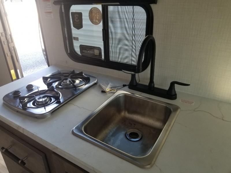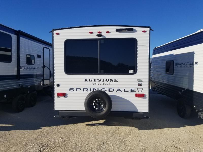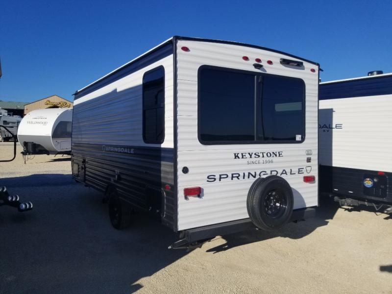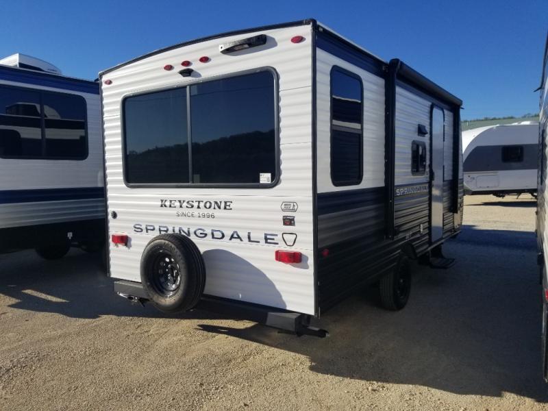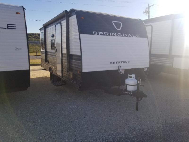With any Springdale Mini travel trailer by Keystone, you will enjoy lightweight towing thanks to their single-axle! The AlphaPly TPO roof membrane is ultra durable, and the power awning will provide protection from the sun as you relax in your camp chairs outside. Each model includes blackout night shades, LED lighting, plus many more interior comforts. There is also a roof A/C and 20K BTU furnace to keep you comfortable, plus a tankless water heater for endless hot showers!