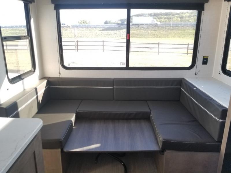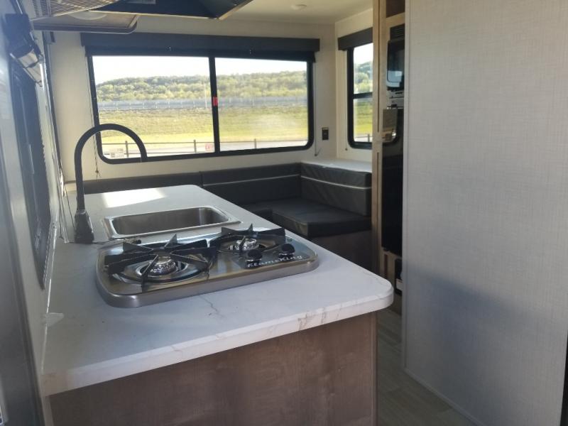 You will find lots of storage inside and outside this trailer allowing you to bring along everything you need for a great camping trip! Along the exterior there is a pass-thru compartment for your outdoor gear and a 10' power awning giving you a covered outdoor living area to enjoy. The cook will have a two burner gas range to make meals, and everyone can dine around the U-shaped dinette. There is a full bathroom to get cleaned up in before bedtime, and a queen bed to fall asleep quickly so you can have fun again tomorrow.