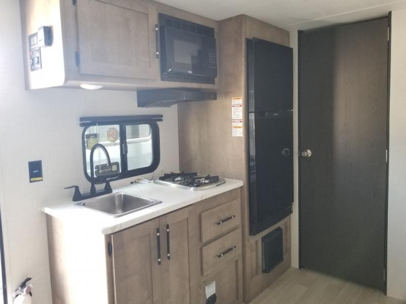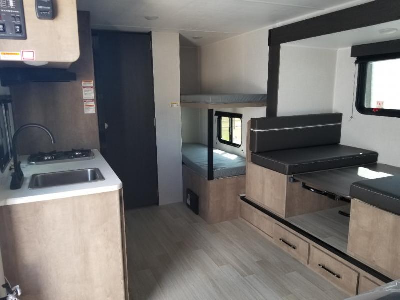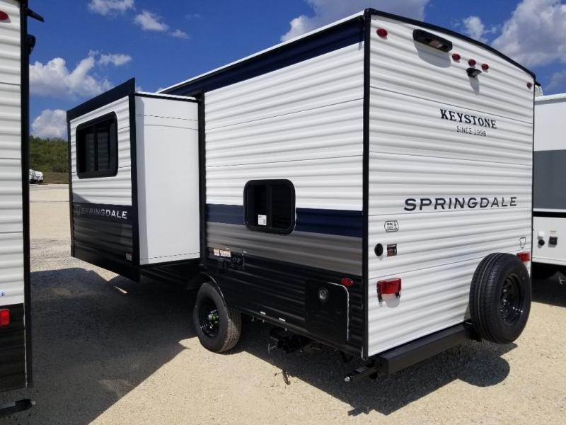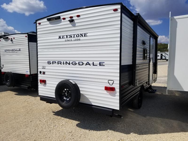 With any Springdale Mini travel trailer by Keystone, you will enjoy lightweight towing thanks to their single-axle! The AlphaPly TPO roof membrane is ultra durable, and the power awning will provide protection from the sun as you relax in your camp chairs outside. Each model includes blackout night shades, LED lighting, plus many more interior comforts. There is also a roof A/C and 20K BTU furnace to keep you comfortable, plus a tankless water heater for endless hot showers!