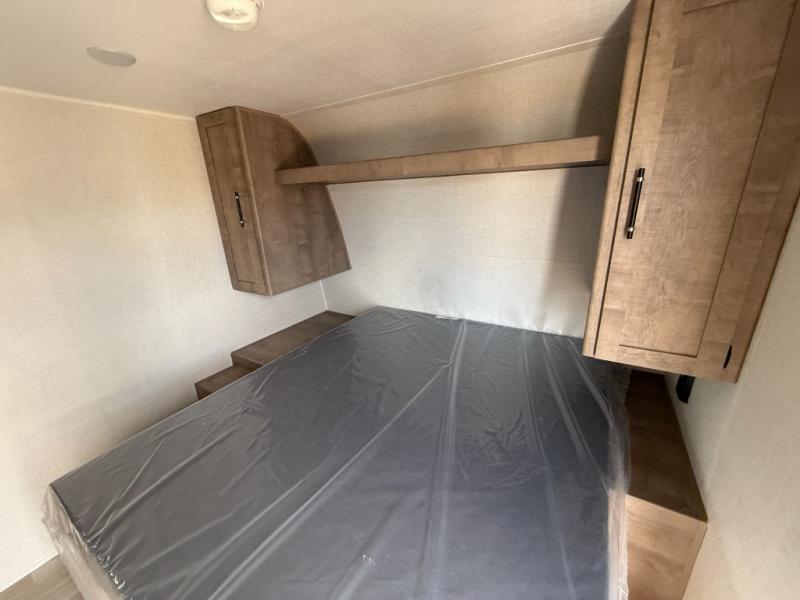 This is the perfect couple's RV with a walk-around queen bed up front with dual closets and nightstands, and a spacious rear bathroom. The galley kitchen offers a two burner cooktop and a sink to wash the dishes, plus there is a 7.7 cu. ft. 12V refrigerator for the cold items. You two can dine at the booth dinette slide which offers more floor space, plus there is drawer storage for your hand towels, pots and/or blankets. The 10' power awning provides protection so you can sit on your camping chairs while enjoying the outdoors.