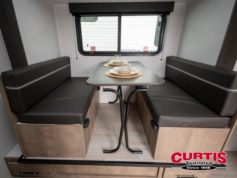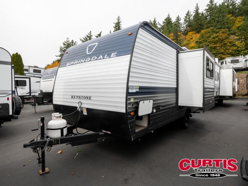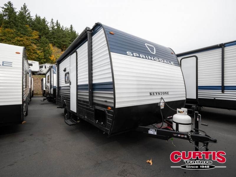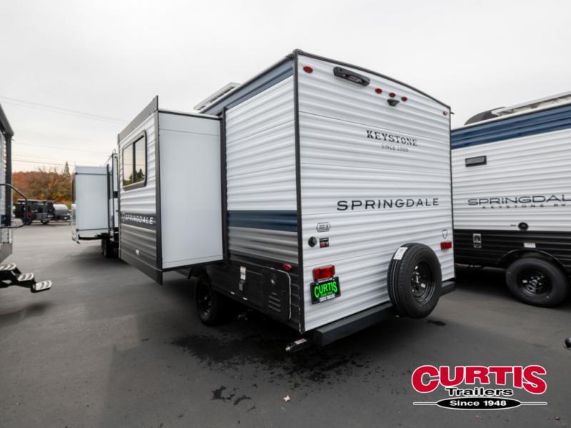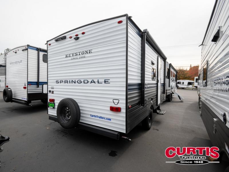 With any Springdale Mini travel trailer by Keystone, you will enjoy lightweight towing thanks to their single-axle! The AlphaPly TPO roof membrane is ultra durable, and the power awning will provide protection from the sun as you relax in your camp chairs outside. Each model includes blackout night shades, LED lighting, plus many more interior comforts. There is also a roof A/C and 20K BTU furnace to keep you comfortable, plus a tankless water heater for endless hot showers!
