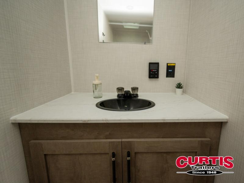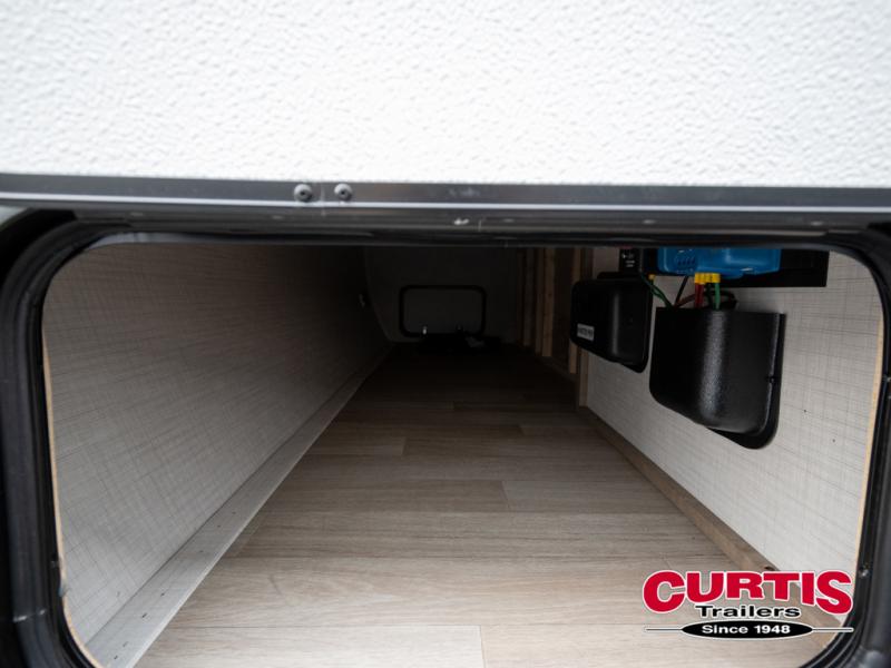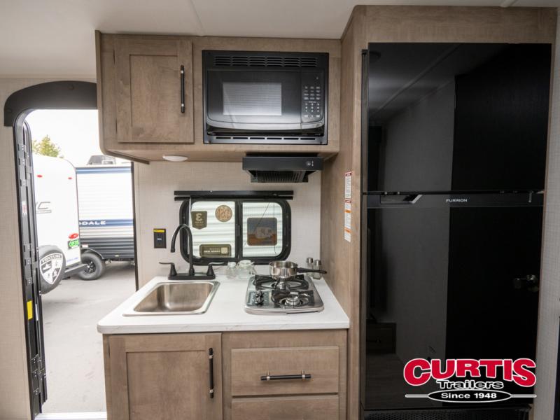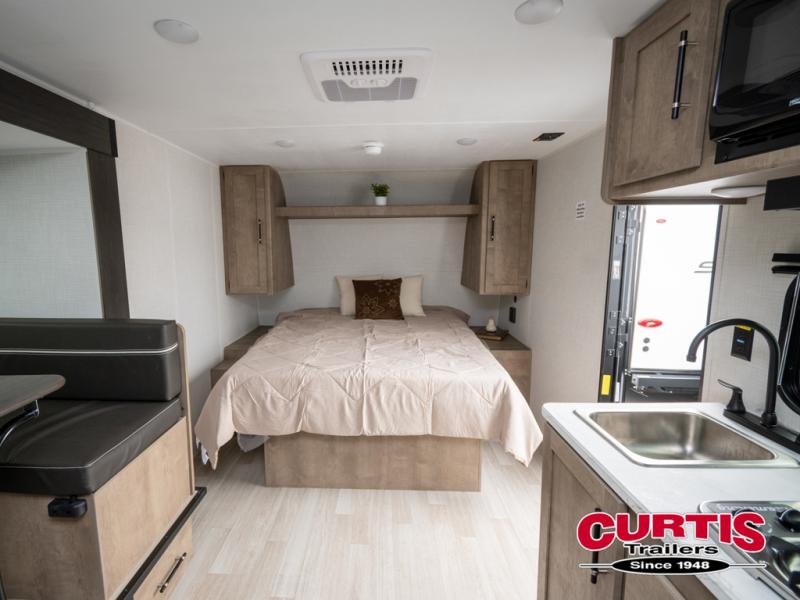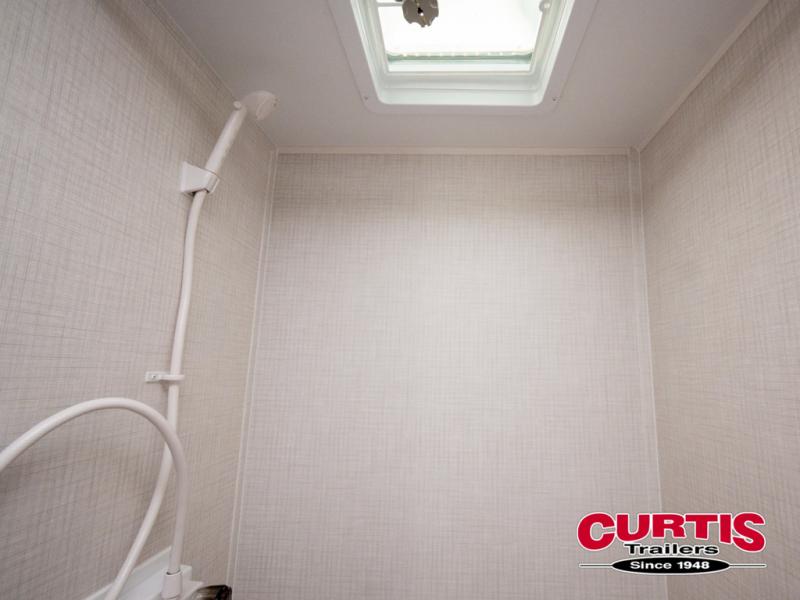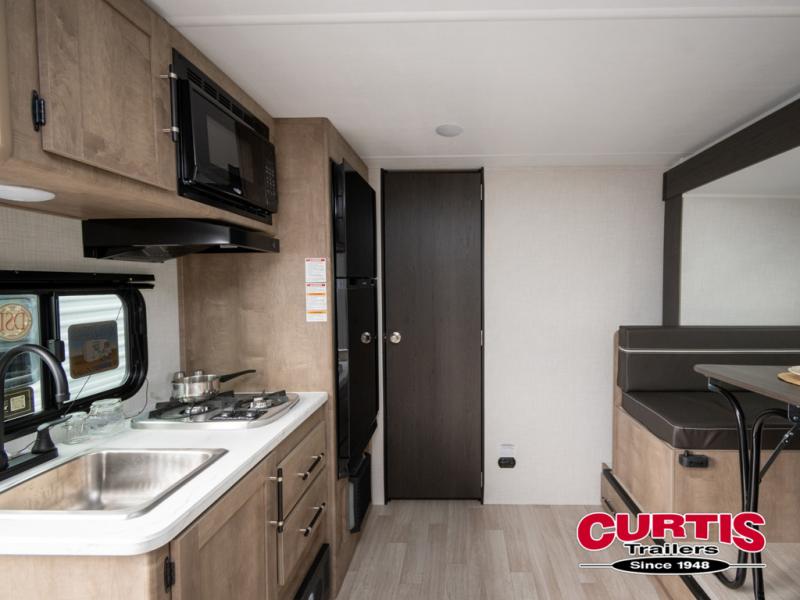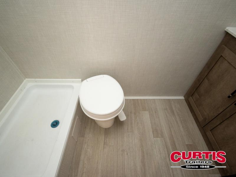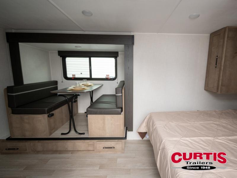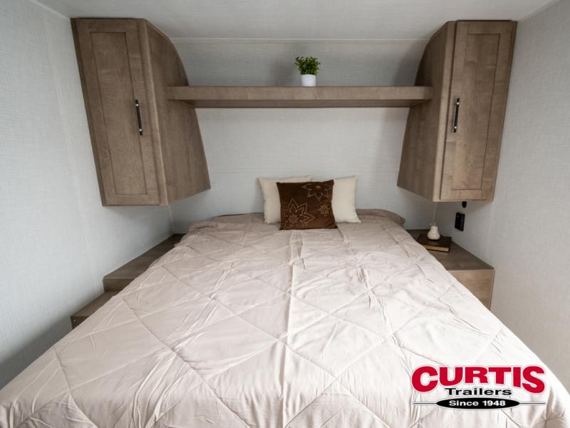 This is the perfect couple's RV with a walk-around queen bed up front with dual closets and nightstands, and a spacious rear bathroom. The galley kitchen offers a two burner cooktop and a sink to wash the dishes, plus there is a 7.7 cu. ft. 12V refrigerator for the cold items. You two can dine at the booth dinette slide which offers more floor space, plus there is drawer storage for your hand towels, pots and/or blankets. The 10' power awning provides protection so you can sit on your camping chairs while enjoying the outdoors.