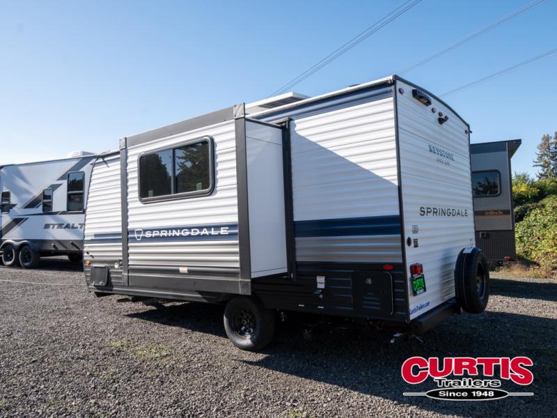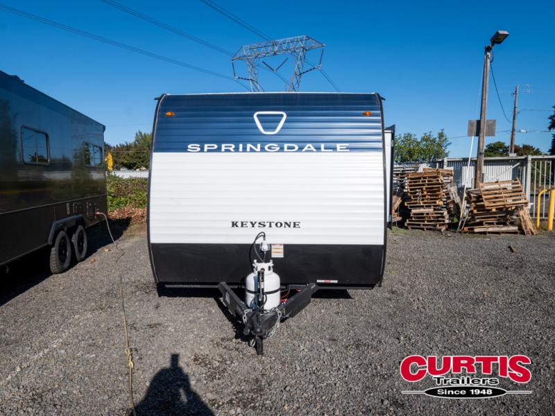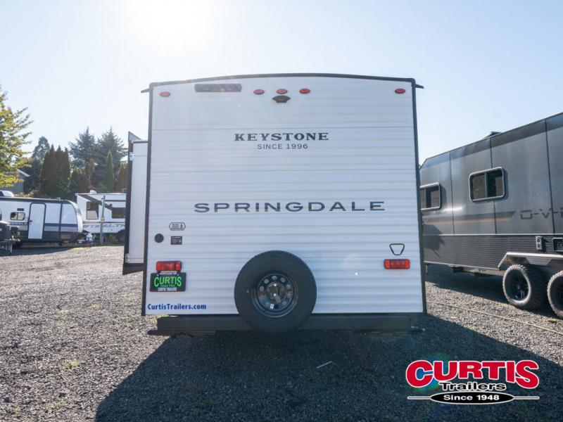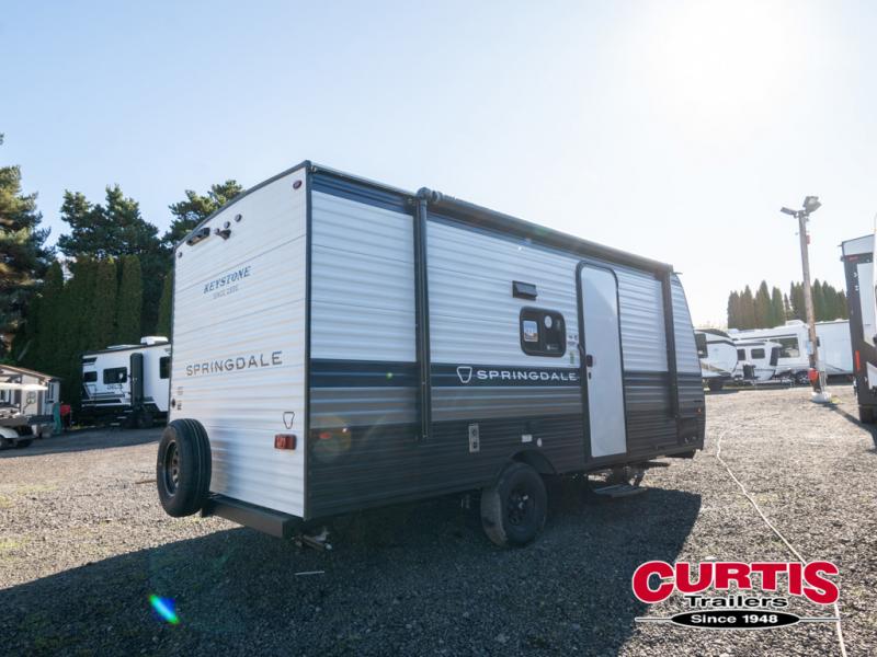 With any Springdale Mini travel trailer by Keystone, you will enjoy lightweight towing thanks to their single-axle! The AlphaPly TPO roof membrane is ultra durable, and the power awning will provide protection from the sun as you relax in your camp chairs outside. Each model includes blackout night shades, LED lighting, plus many more interior comforts. There is also a roof A/C and 20K BTU furnace to keep you comfortable, plus a tankless water heater for endless hot showers!
