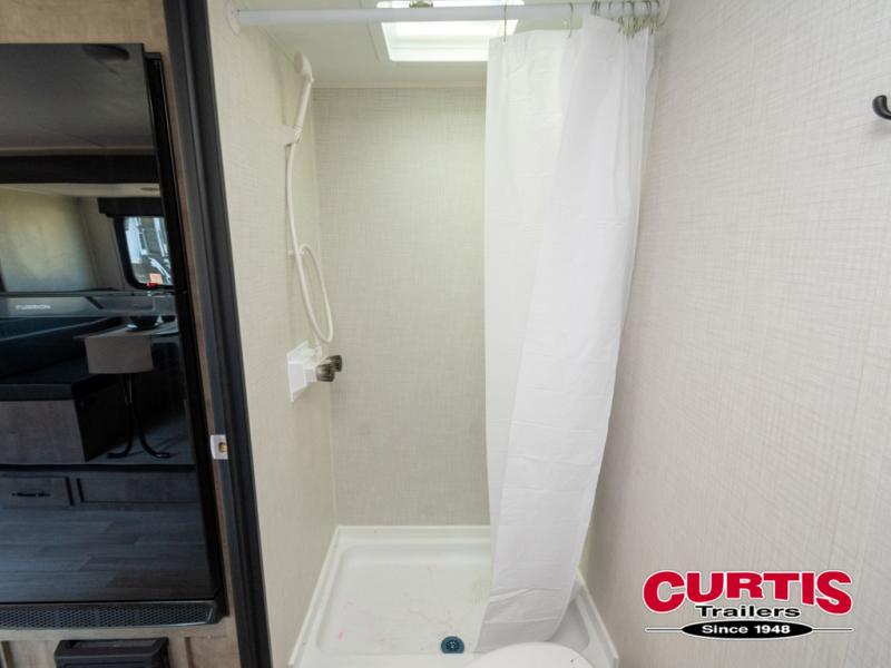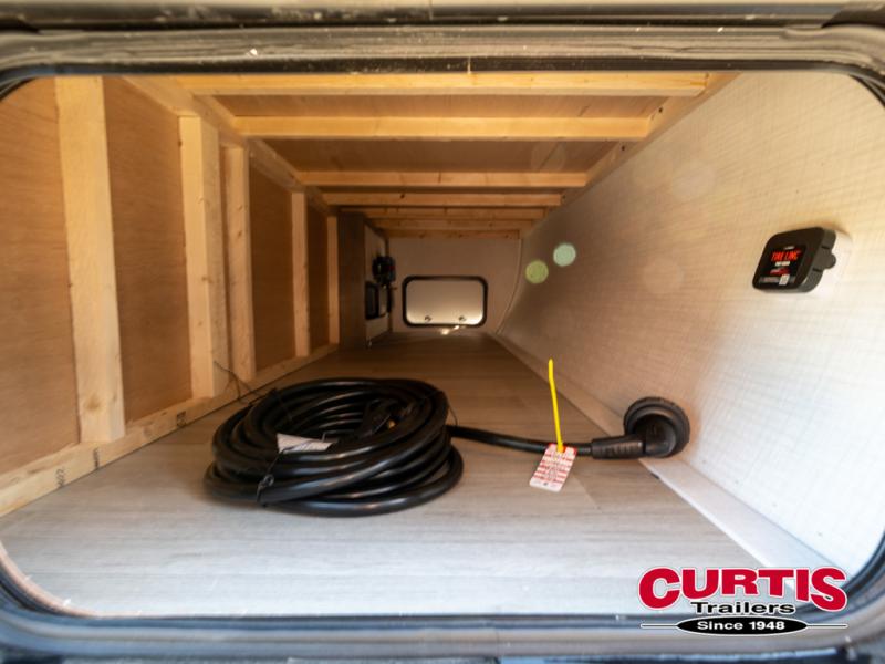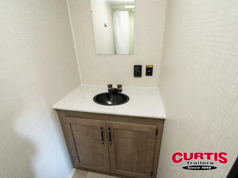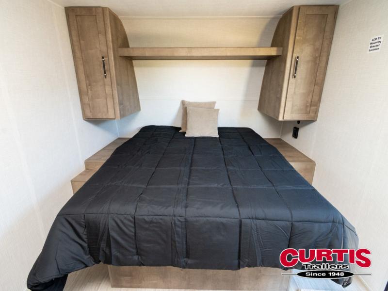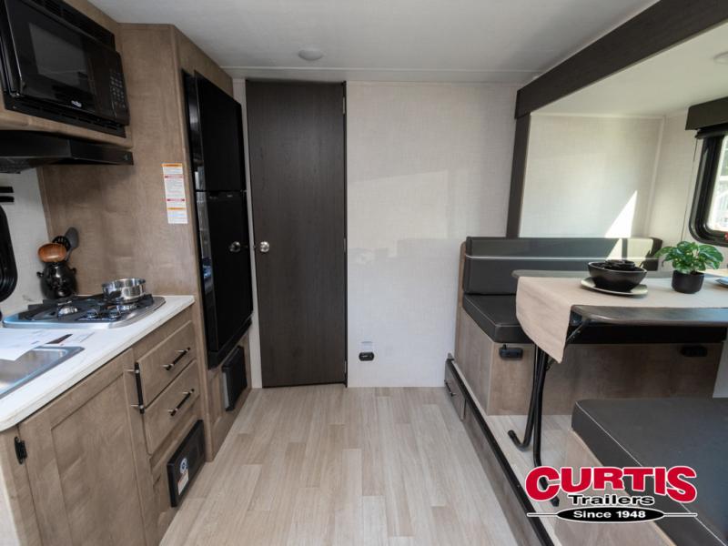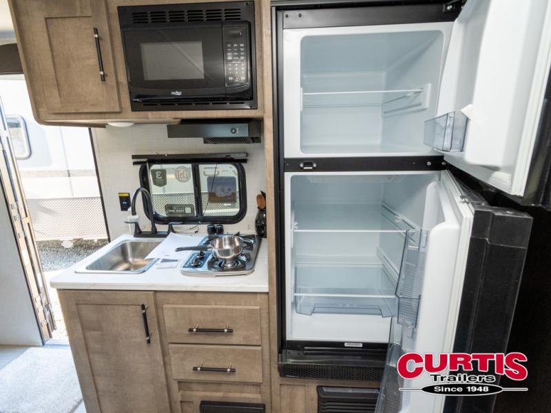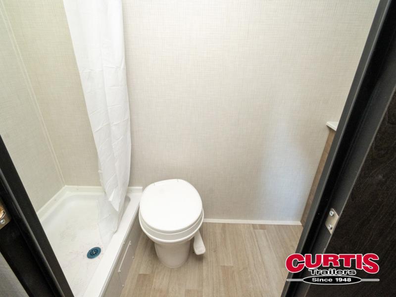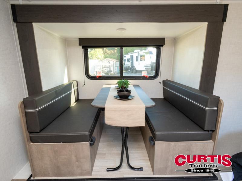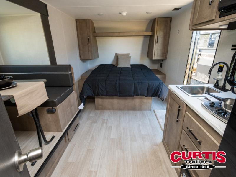 This is the perfect couple's RV with a walk-around queen bed up front with dual closets and nightstands, and a spacious rear bathroom. The galley kitchen offers a two burner cooktop and a sink to wash the dishes, plus there is a 7.7 cu. ft. 12V refrigerator for the cold items. You two can dine at the booth dinette slide which offers more floor space, plus there is drawer storage for your hand towels, pots and/or blankets. The 10' power awning provides protection so you can sit on your camping chairs while enjoying the outdoors.