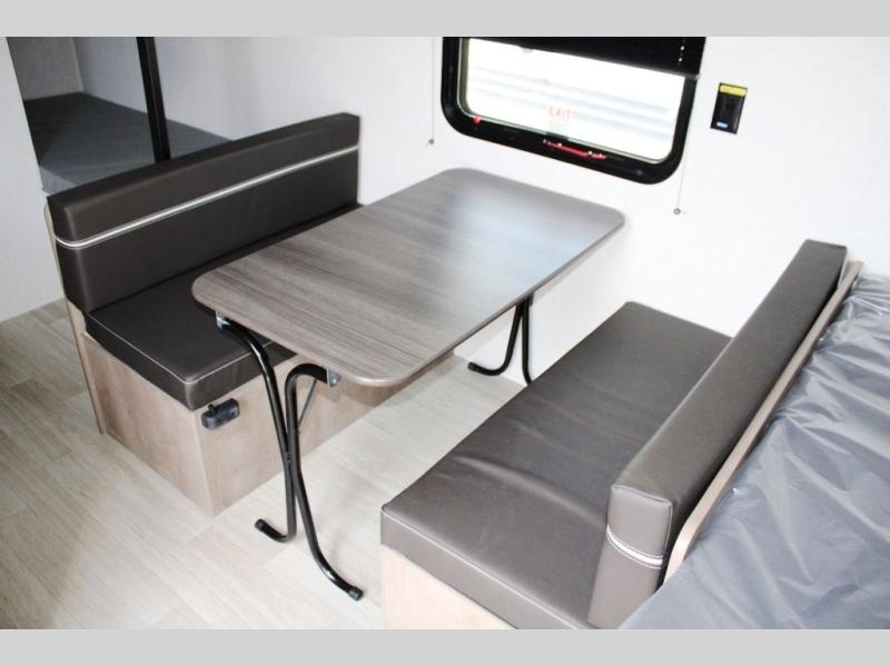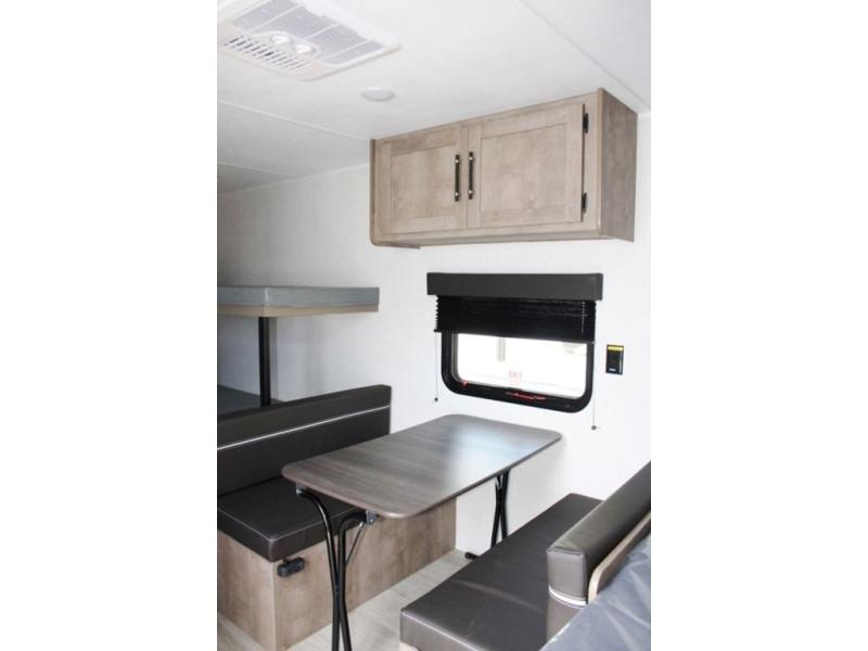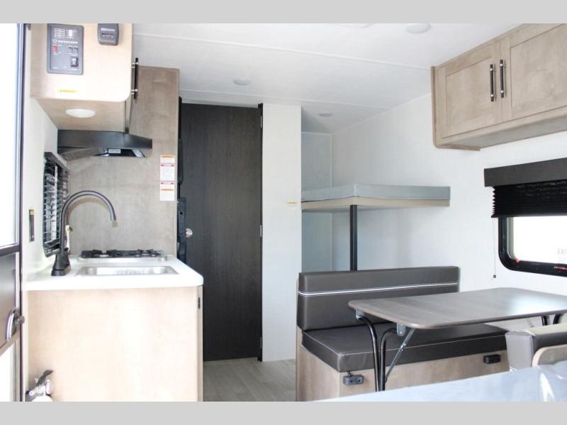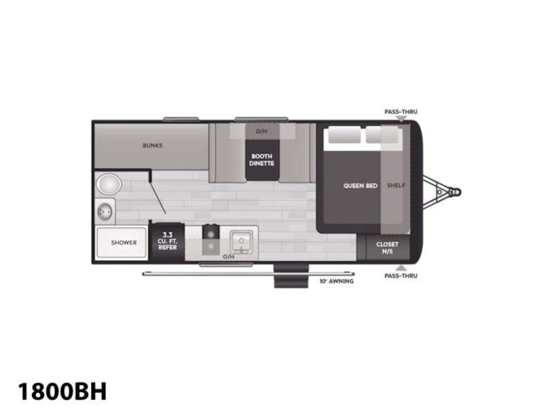 Get ready for outdoor fun with your favorite people when you have this trailer in tow! Once at your campsite, you can easily setup the 10' power awning, grab your camping chairs from the pass-thru storage, and relax or start playing. The cook will love the galley kitchen with the two burner cooktop, plus a refrigerator for cold items. If you like, you can eat inside at the booth dinette which doubles as sleeping space, and of course the kids will love the bunk beds next to the full bathroom. And you will sleep soundly on the front queen bed.
