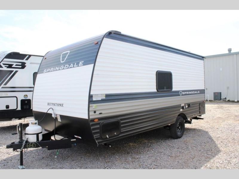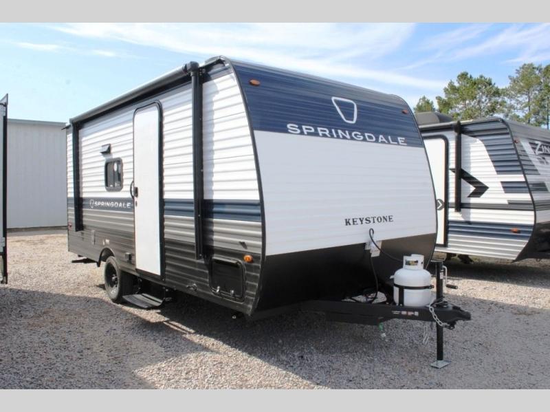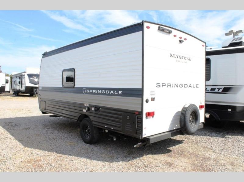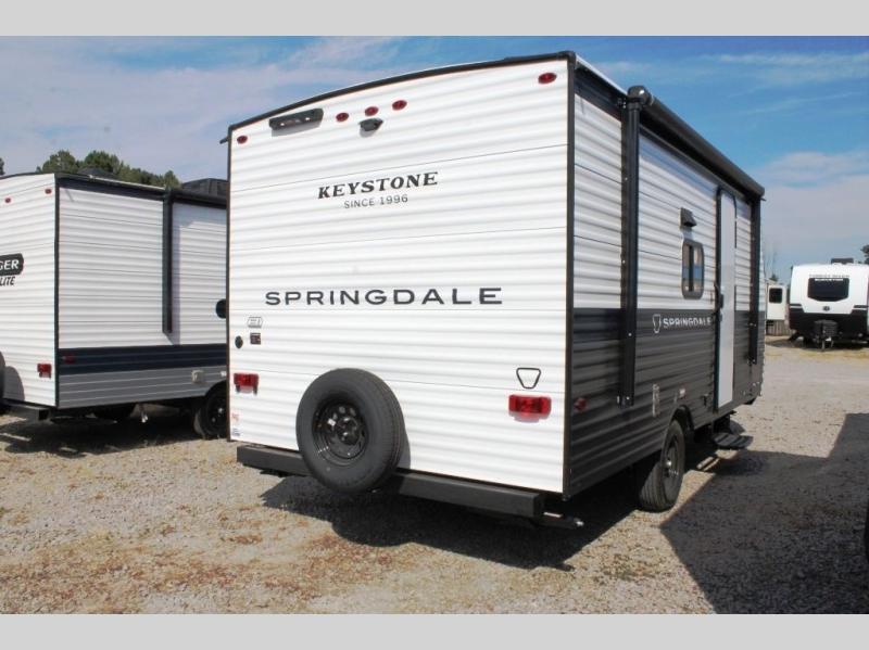 With any Springdale Mini travel trailer by Keystone, you will enjoy lightweight towing thanks to their single-axle! The AlphaPly TPO roof membrane is ultra durable, and the power awning will provide protection from the sun as you relax in your camp chairs outside. Each model includes blackout night shades, LED lighting, plus many more interior comforts. There is also a roof A/C and 20K BTU furnace to keep you comfortable, plus a tankless water heater for endless hot showers!