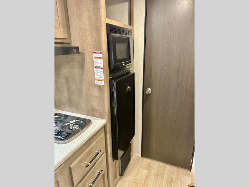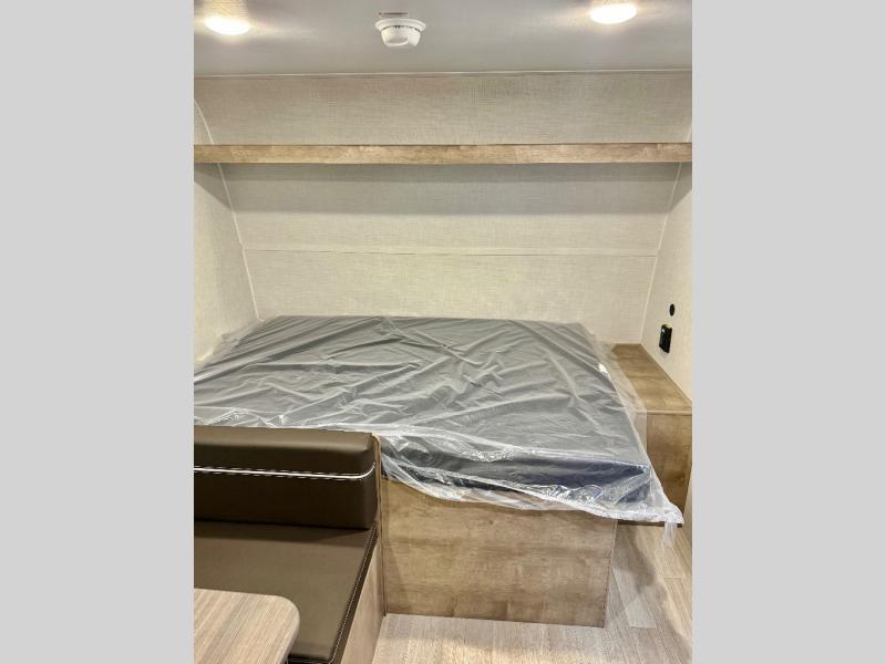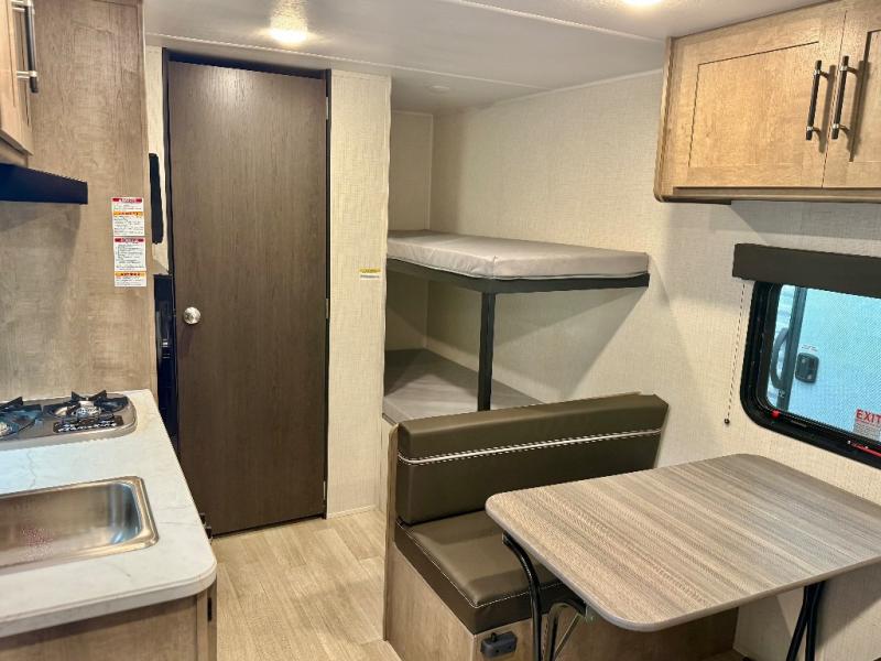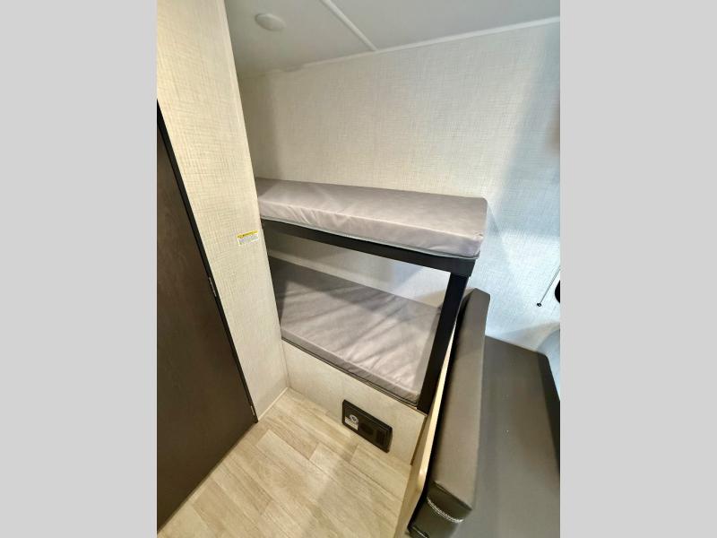 Get ready for outdoor fun with your favorite people when you have this trailer in tow! Once at your campsite, you can easily setup the 10' power awning, grab your camping chairs from the pass-thru storage, and relax or start playing. The cook will love the galley kitchen with the two burner cooktop, plus a refrigerator for cold items. If you like, you can eat inside at the booth dinette which doubles as sleeping space, and of course the kids will love the bunk beds next to the full bathroom. And you will sleep soundly on the front queen bed.