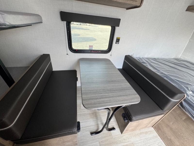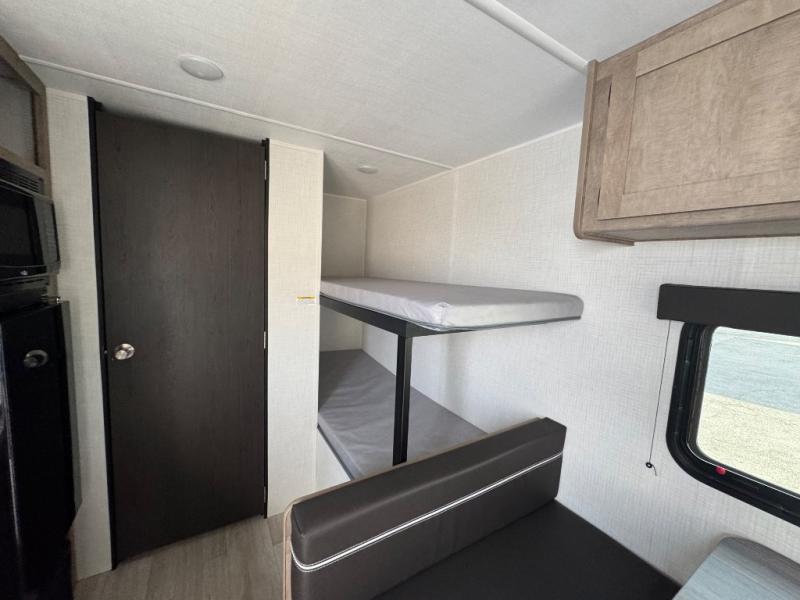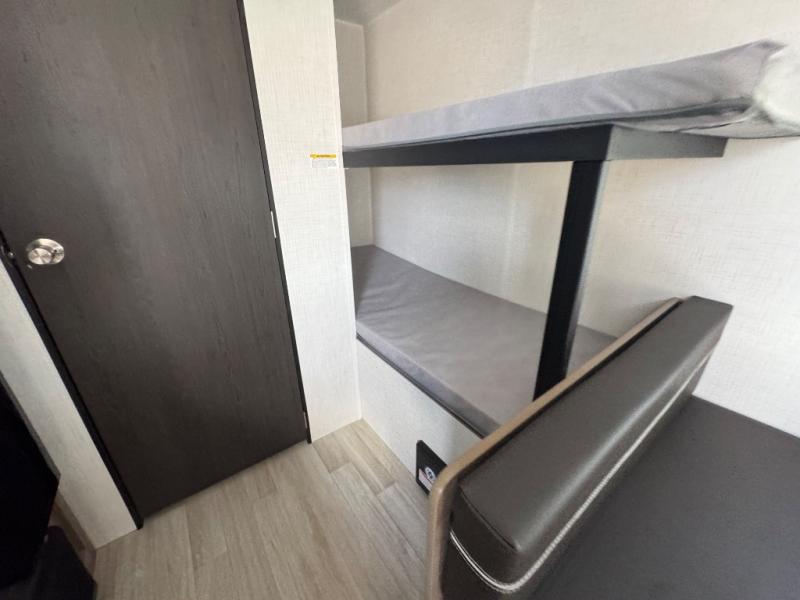Get ready for outdoor fun with your favorite people when you have this trailer in tow! Once at your campsite, you can easily setup the 10' power awning, grab your camping chairs from the pass-thru storage, and relax or start playing. The cook will love the galley kitchen with the two burner cooktop, plus a refrigerator for cold items. If you like, you can eat inside at the booth dinette which doubles as sleeping space, and of course the kids will love the bunk beds next to the full bathroom. And you will sleep soundly on the front queen bed.