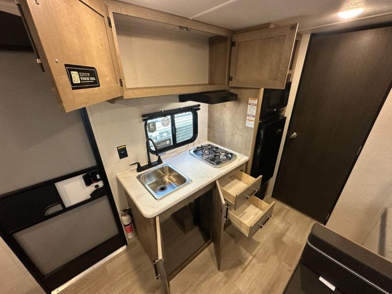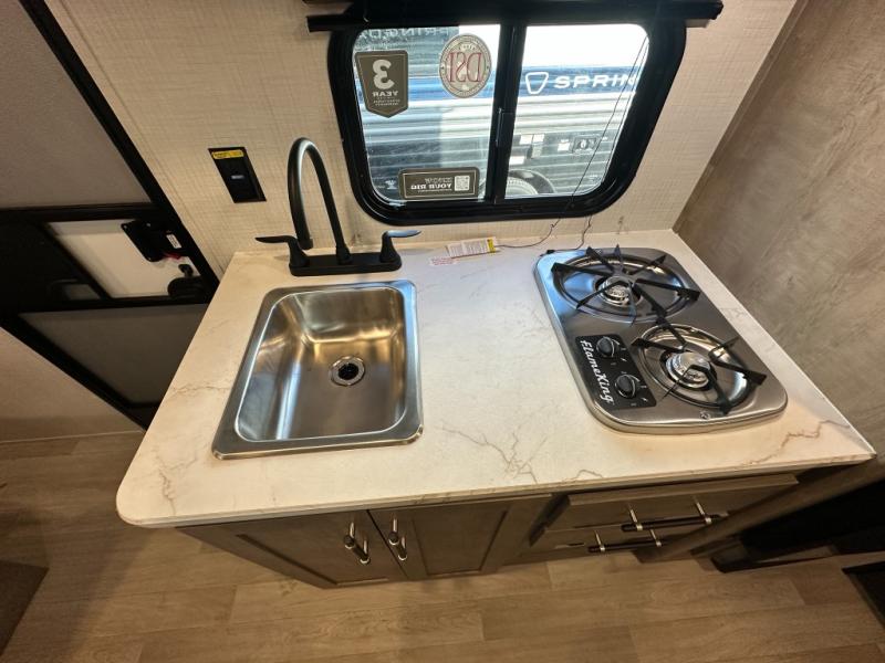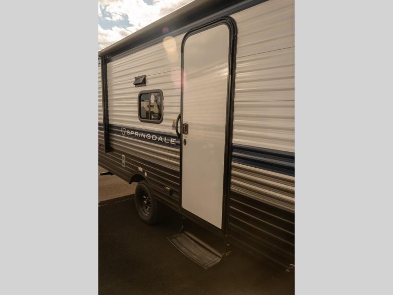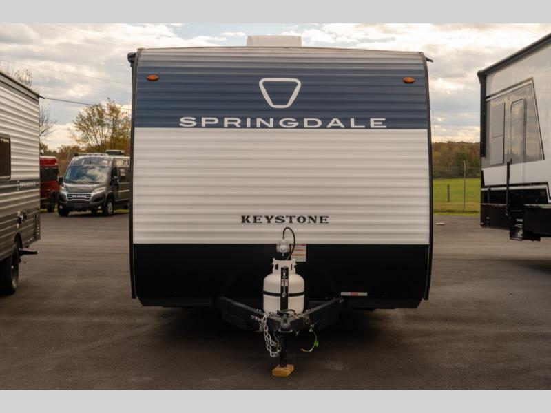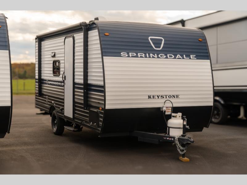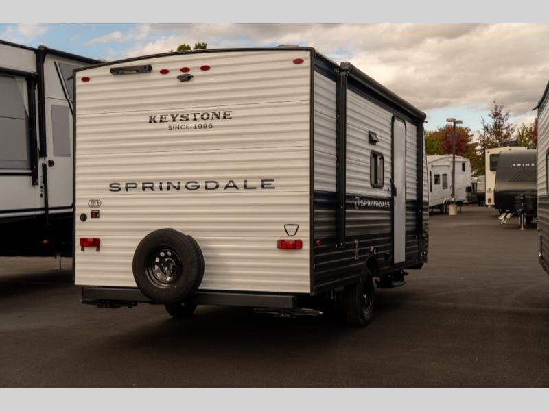 With any Springdale Mini travel trailer by Keystone, you will enjoy lightweight towing thanks to their single-axle! The AlphaPly TPO roof membrane is ultra durable, and the power awning will provide protection from the sun as you relax in your camp chairs outside. Each model includes blackout night shades, LED lighting, plus many more interior comforts. There is also a roof A/C and 20K BTU furnace to keep you comfortable, plus a tankless water heater for endless hot showers!