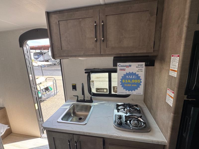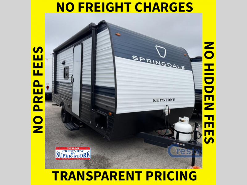 With any Springdale Mini travel trailer by Keystone, you will enjoy lightweight towing thanks to their single-axle! The AlphaPly TPO roof membrane is ultra durable, and the power awning will provide protection from the sun as you relax in your camp chairs outside. Each model includes blackout night shades, LED lighting, plus many more interior comforts. There is also a roof A/C and 20K BTU furnace to keep you comfortable, plus a tankless water heater for endless hot showers!
