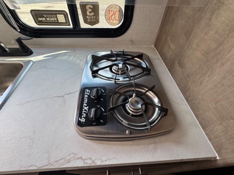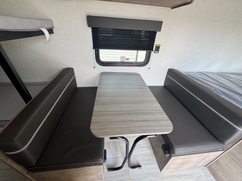 Get ready for outdoor fun with your favorite people when you have this trailer in tow! Once at your campsite, you can easily setup the 10' power awning, grab your camping chairs from the pass-thru storage, and relax or start playing. The cook will love the galley kitchen with the two burner cooktop, plus a refrigerator for cold items. If you like, you can eat inside at the booth dinette which doubles as sleeping space, and of course the kids will love the bunk beds next to the full bathroom. And you will sleep soundly on the front queen bed.