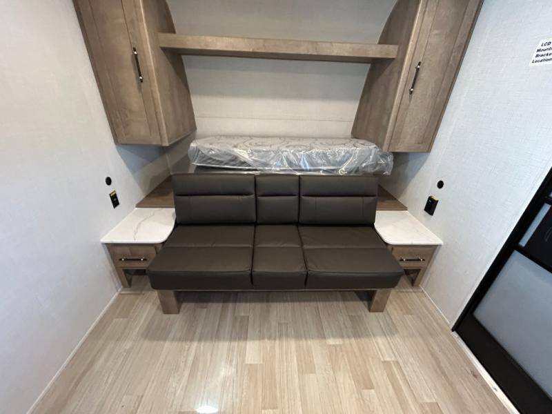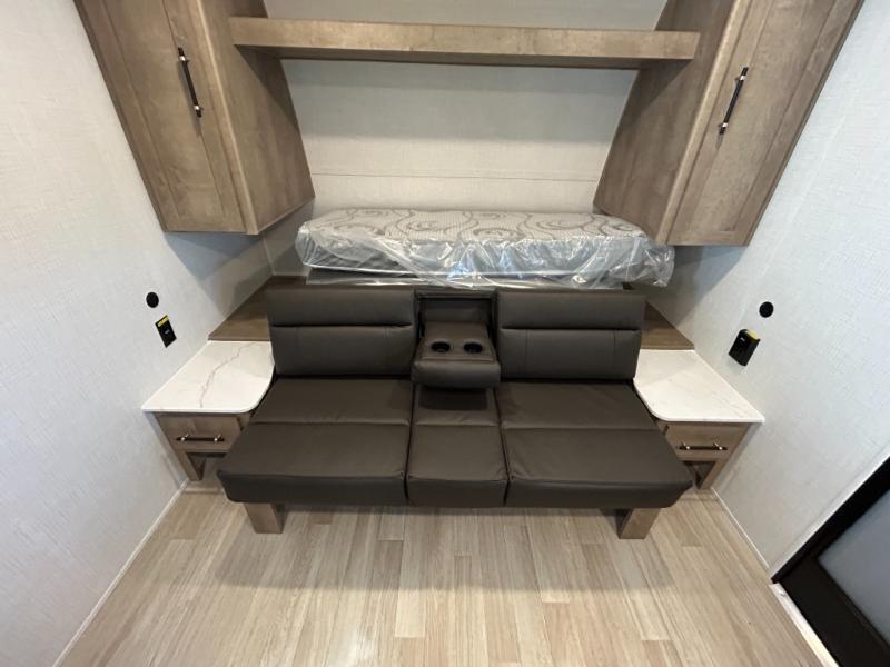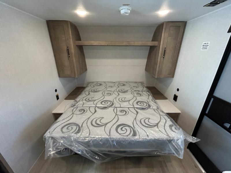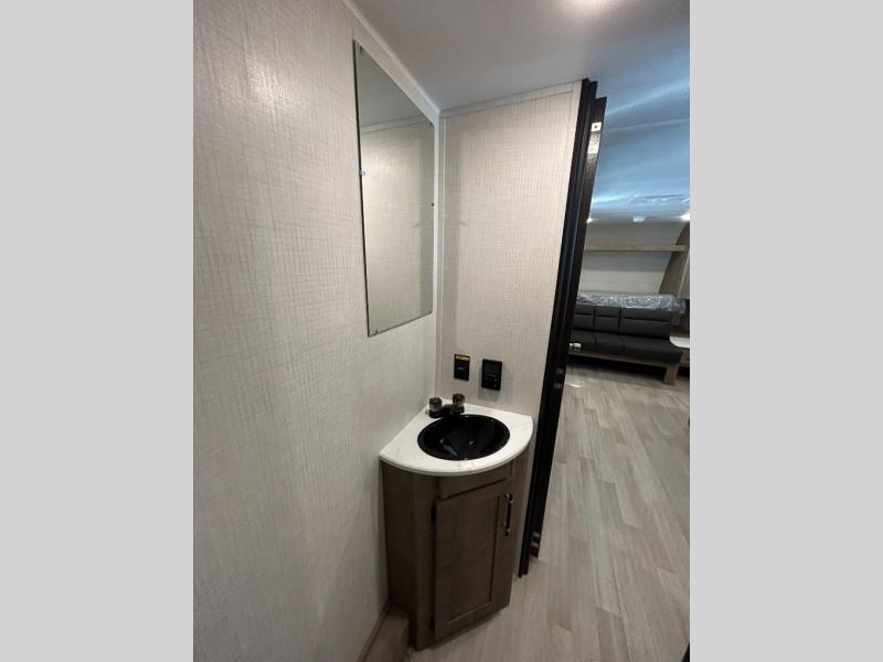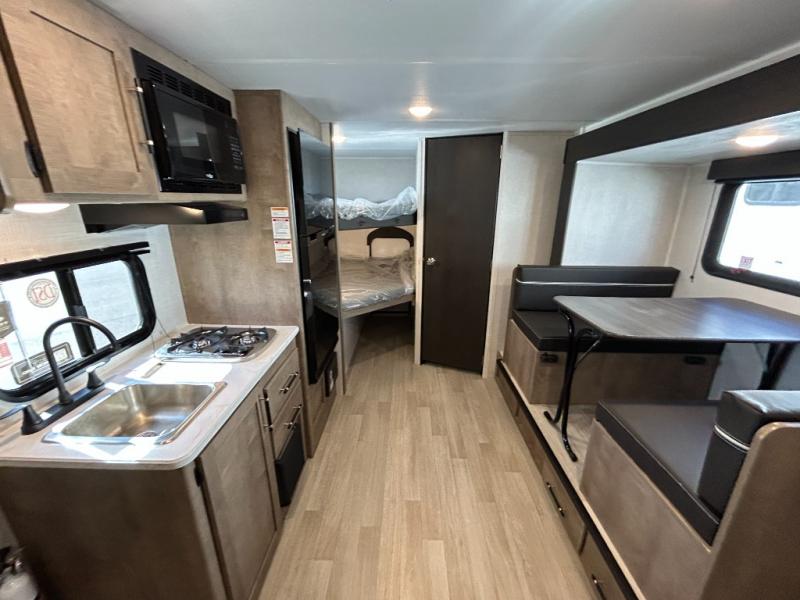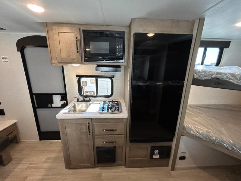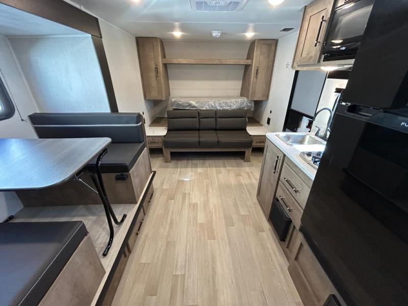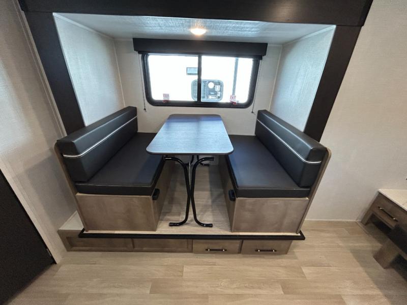 This cute Springdale Mini bunk model will easily sleep seven with the double-size bunks, booth dinette slide, and queen Murphy bed which features a fold-down sofa at the end. During the daytime, you can have the seating you need and want, and at night the sofa folds to become part of the front bed. The rear corner bath is convenient and features a tub/shower, toilet, and sink. The kitchen is fully equipped to allow you to cook as you travel. Enjoy them while under the 15' power awning. A handy pass-thru storage compartment up front offers ample space for camp equipment, and there is additional storage accessible beneath the bunk in back.