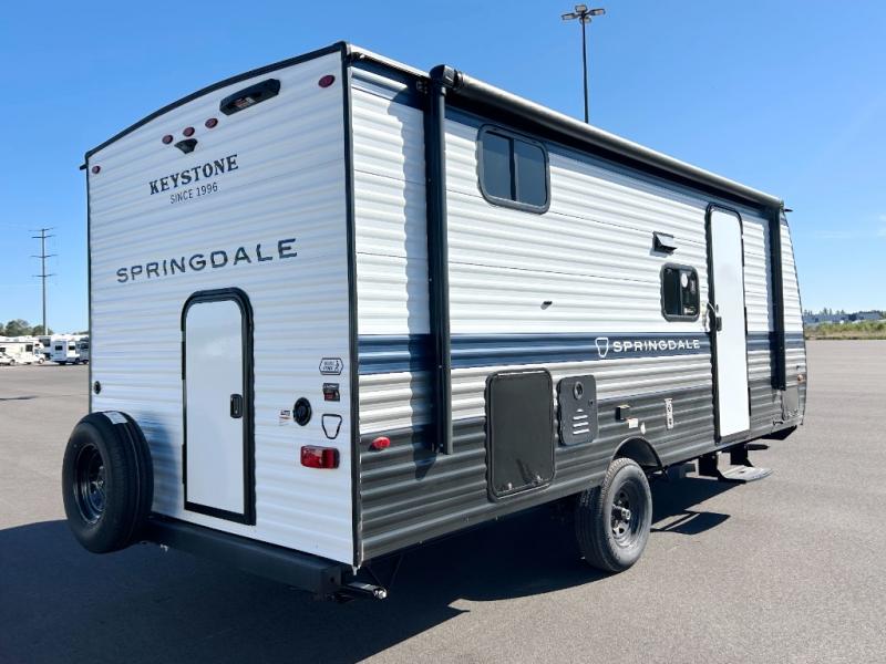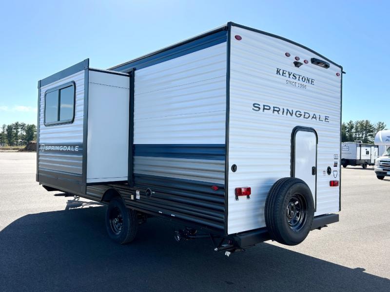 With any Springdale Mini travel trailer by Keystone, you will enjoy lightweight towing thanks to their single-axle! The AlphaPly TPO roof membrane is ultra durable, and the power awning will provide protection from the sun as you relax in your camp chairs outside. Each model includes blackout night shades, LED lighting, plus many more interior comforts. There is also a roof A/C and 20K BTU furnace to keep you comfortable, plus a tankless water heater for endless hot showers!