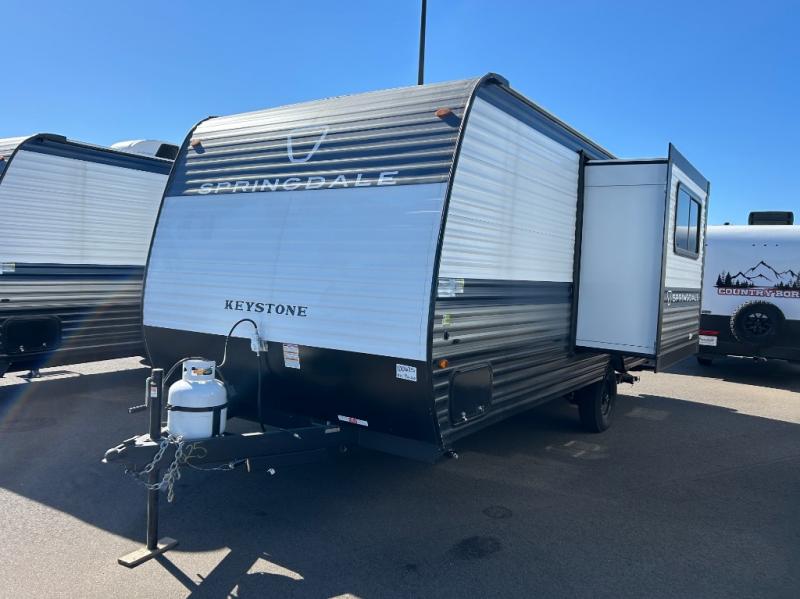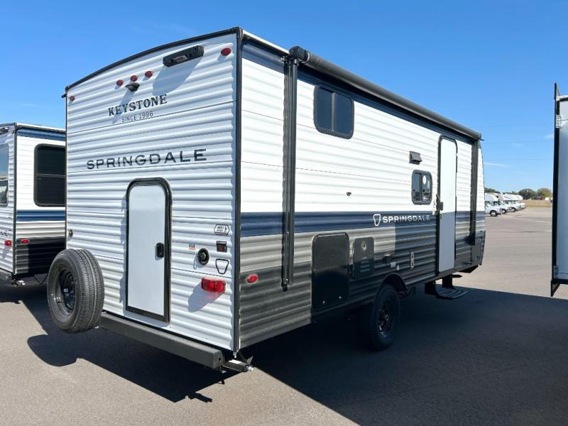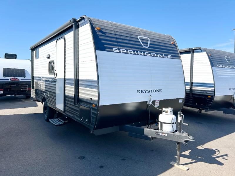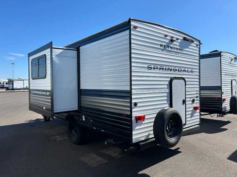 With any Springdale Mini travel trailer by Keystone, you will enjoy lightweight towing thanks to their single-axle! The AlphaPly TPO roof membrane is ultra durable, and the power awning will provide protection from the sun as you relax in your camp chairs outside. Each model includes blackout night shades, LED lighting, plus many more interior comforts. There is also a roof A/C and 20K BTU furnace to keep you comfortable, plus a tankless water heater for endless hot showers!