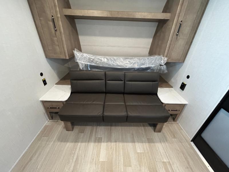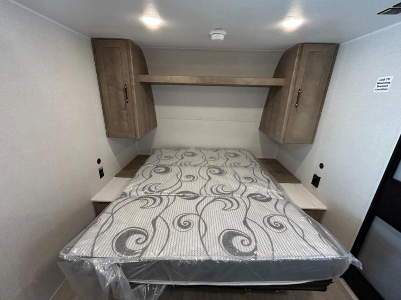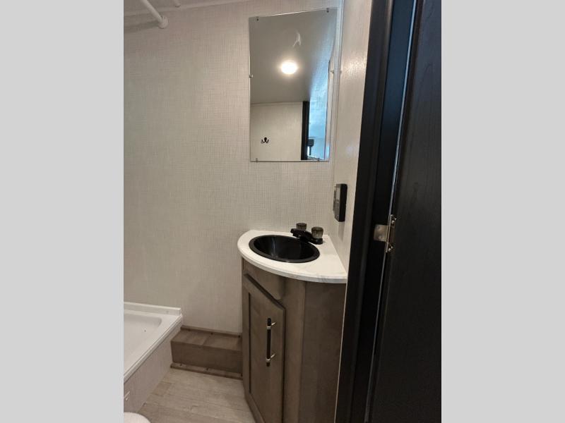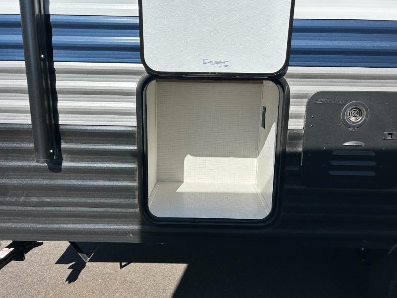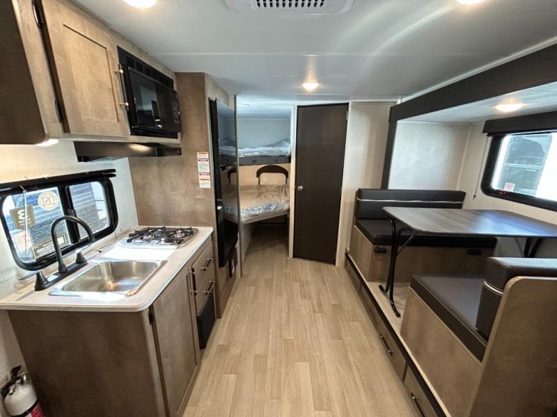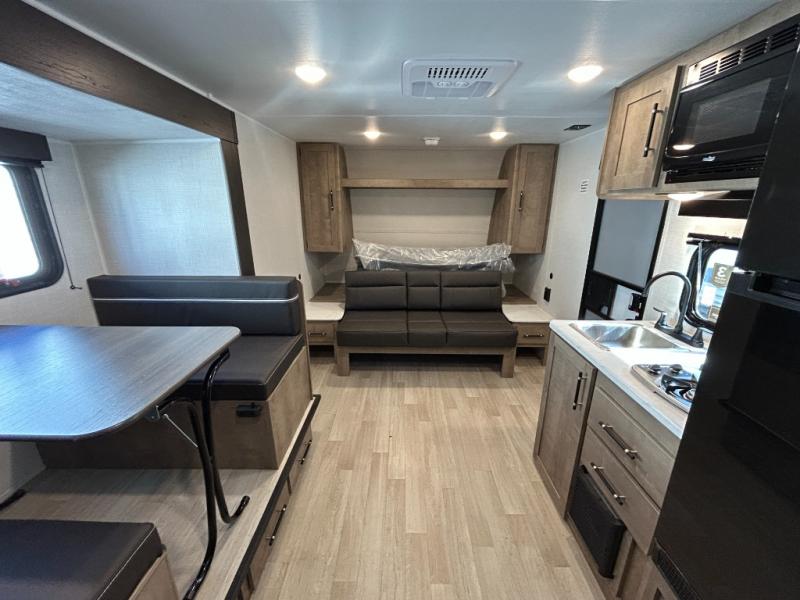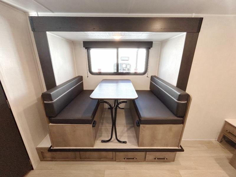 This cute Springdale Mini bunk model will easily sleep seven with the double-size bunks, booth dinette slide, and queen Murphy bed which features a fold-down sofa at the end. During the daytime, you can have the seating you need and want, and at night the sofa folds to become part of the front bed. The rear corner bath is convenient and features a tub/shower, toilet, and sink. The kitchen is fully equipped to allow you to cook as you travel. Enjoy them while under the 15' power awning. A handy pass-thru storage compartment up front offers ample space for camp equipment, and there is additional storage accessible beneath the bunk in back.