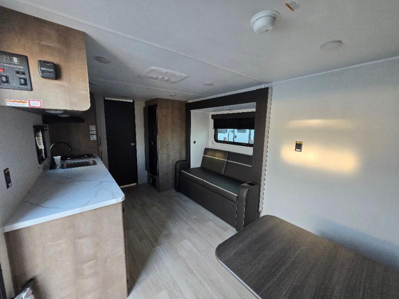 Camping trips just got easier travel trailer that can sleep three to four each night! You'll enjoy more floor space to move about thanks to the sofa slide out, and the full bath is tucked in the back for added privacy. There is generous counter space in the kitchen, along with a two-burner cooktop and microwave oven to cook meals. Up front, you'll find a picnic table to dine at, plus a Murphy style pull-out Olympic RV queen-size bed, giving you both seating and sleeping space. Dual bedside wardrobes will let you keep your clothes organized, and an exterior pass-through storage will be perfect for fishing poles, camp chairs and more!