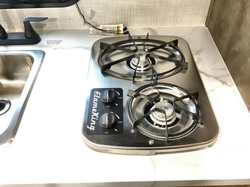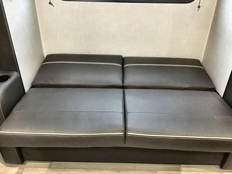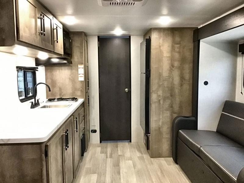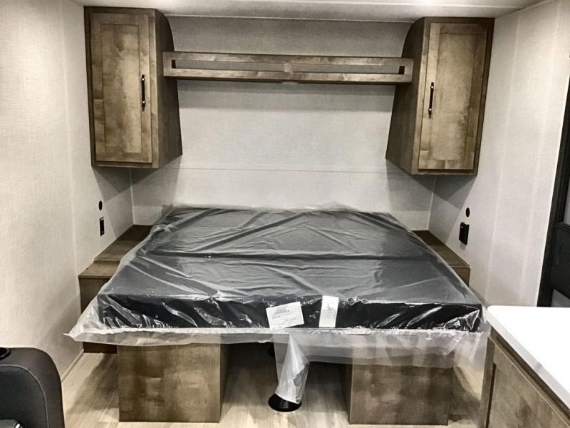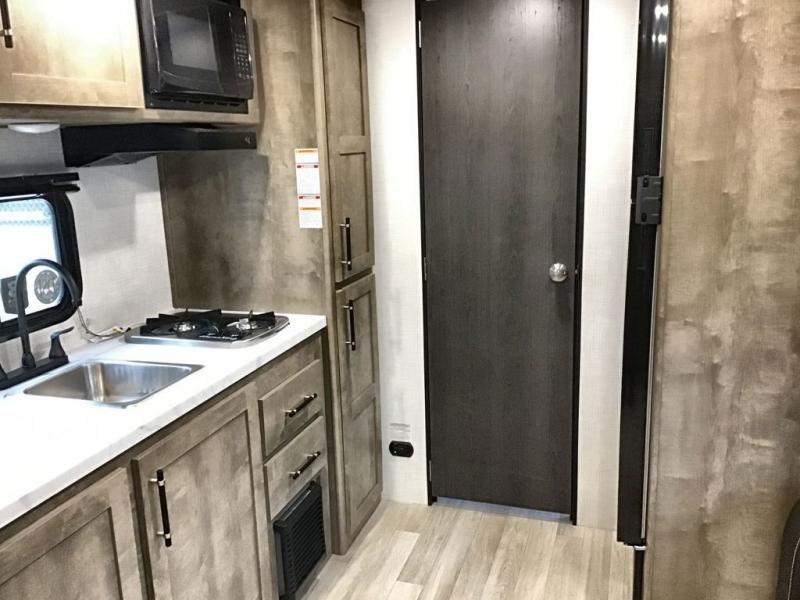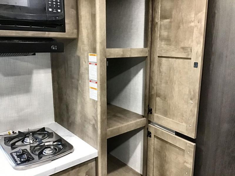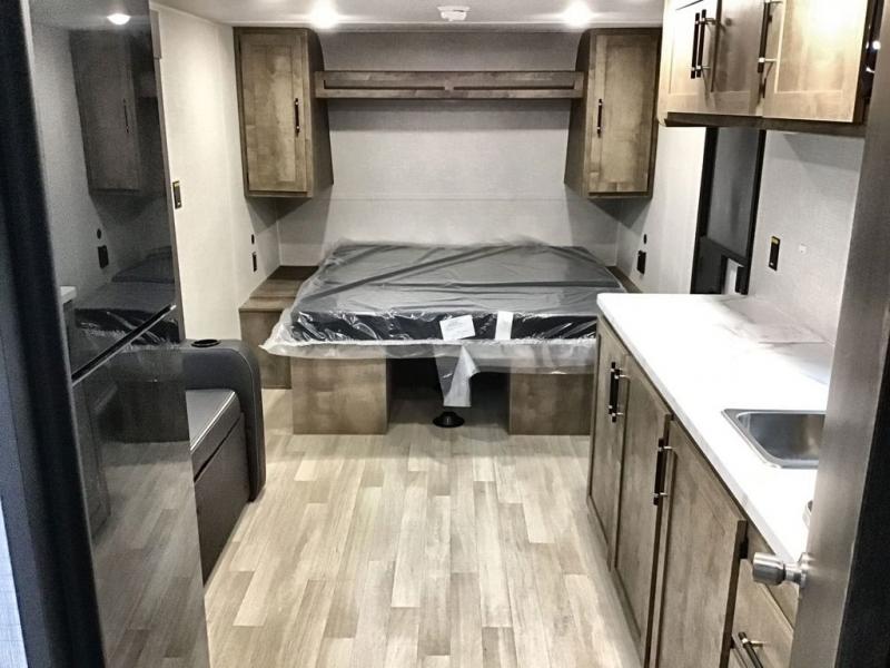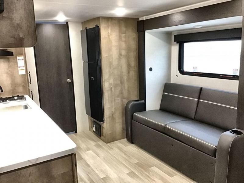 Camping trips just got easier travel trailer that can sleep three to four each night! You'll enjoy more floor space to move about thanks to the sofa slide out, and the full bath is tucked in the back for added privacy. There is generous counter space in the kitchen, along with a two-burner cooktop and microwave oven to cook meals. Up front, you'll find a picnic table to dine at, plus a Murphy style pull-out Olympic RV queen-size bed, giving you both seating and sleeping space. Dual bedside wardrobes will let you keep your clothes organized, and an exterior pass-through storage will be perfect for fishing poles, camp chairs and more!