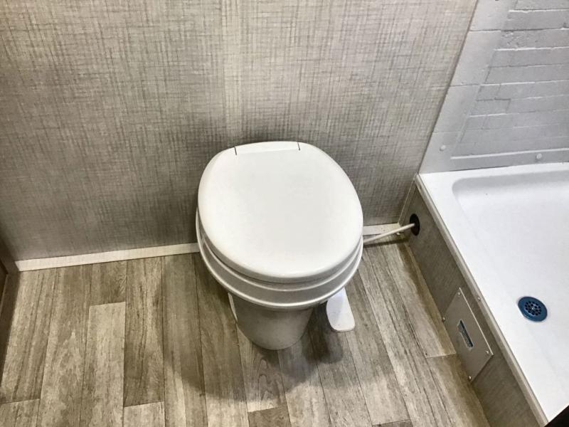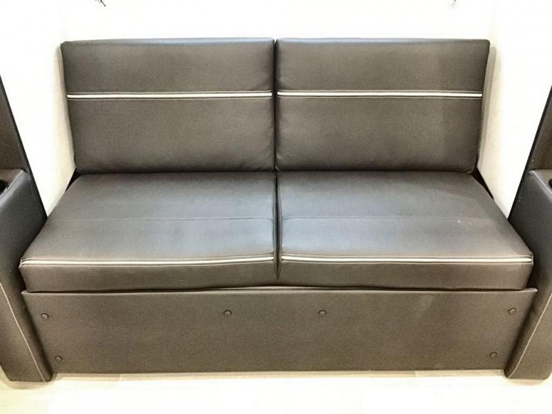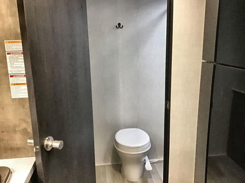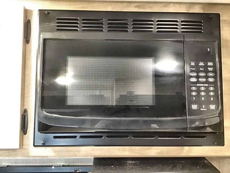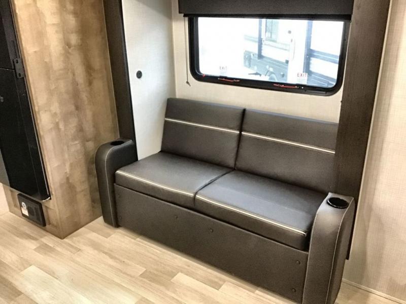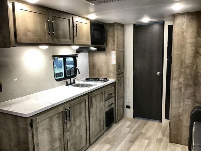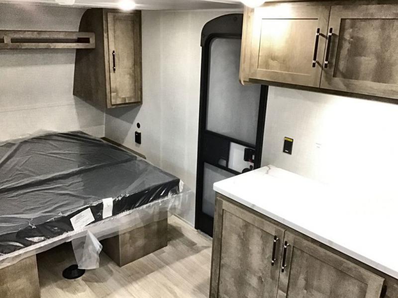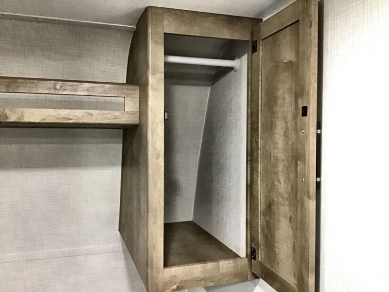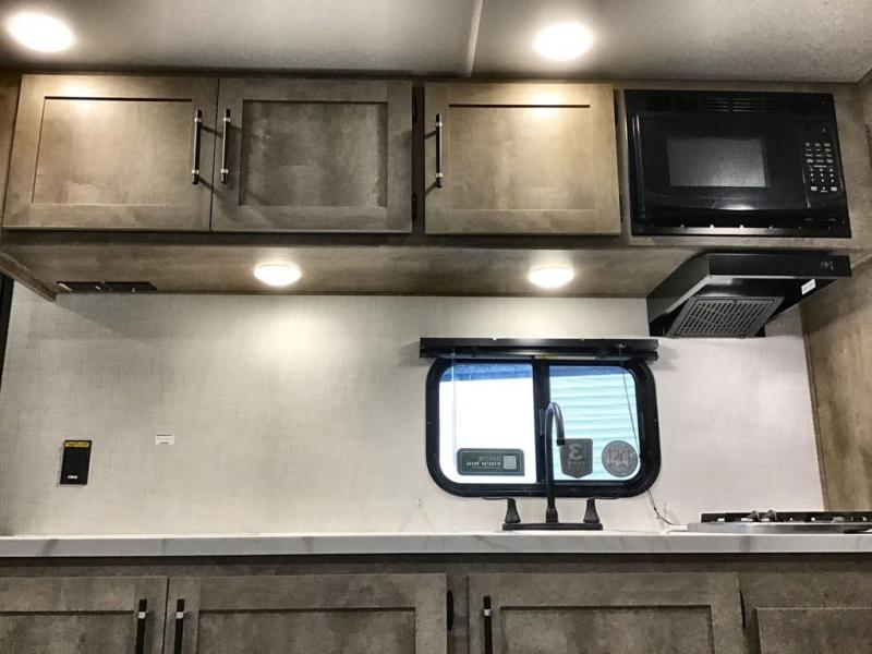 Camping trips just got easier travel trailer that can sleep three to four each night! You'll enjoy more floor space to move about thanks to the sofa slide out, and the full bath is tucked in the back for added privacy. There is generous counter space in the kitchen, along with a two-burner cooktop and microwave oven to cook meals. Up front, you'll find a picnic table to dine at, plus a Murphy style pull-out Olympic RV queen-size bed, giving you both seating and sleeping space. Dual bedside wardrobes will let you keep your clothes organized, and an exterior pass-through storage will be perfect for fishing poles, camp chairs and more!