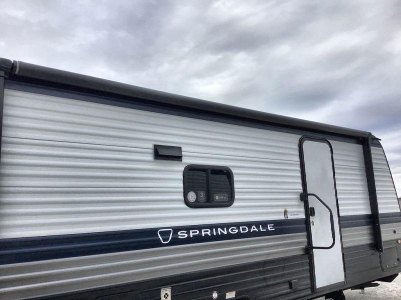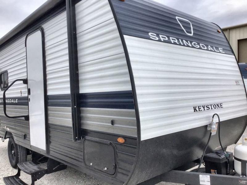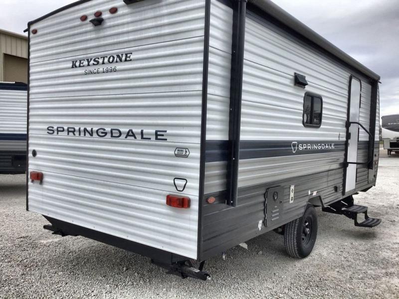 With any Springdale Mini travel trailer by Keystone, you will enjoy lightweight towing thanks to their single axle! The XL tinted safety glass windows are ultra durable, and the power awning will provide protection from the sun as you relax in your camp chairs outside. Each model includes blackout night shades, LED lighting, plus many more interior comforts. There is also a 20K BTU furnace to keep you comfortable, plus a tankless water heater for endless hot showers!
