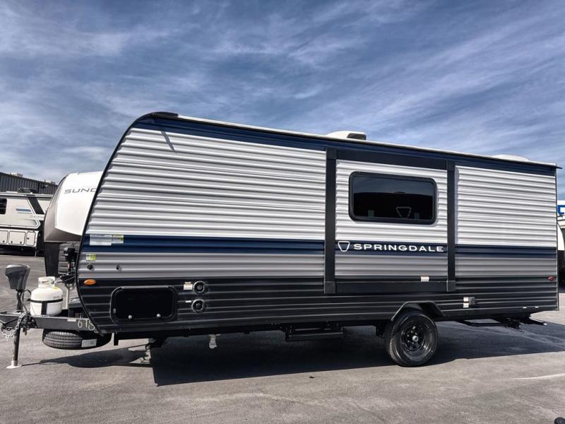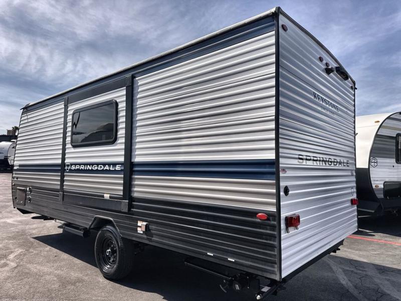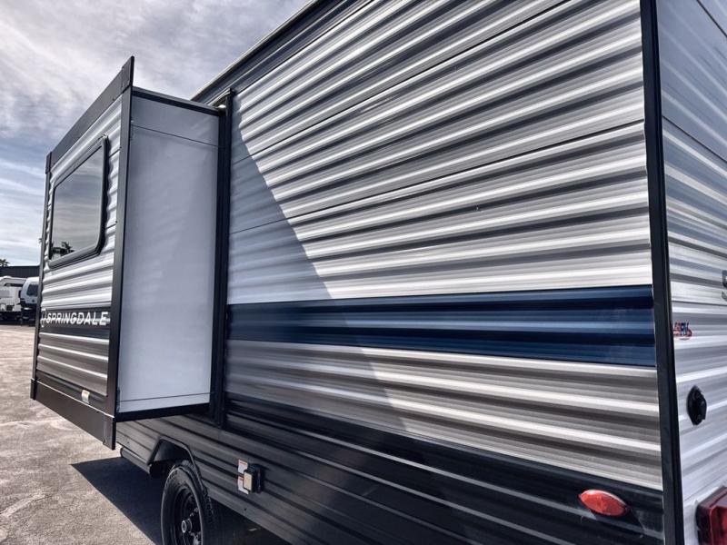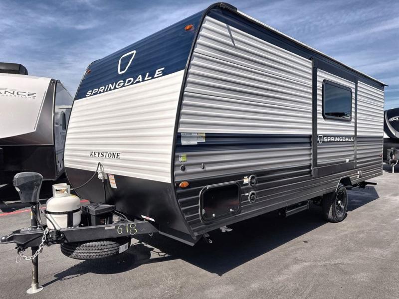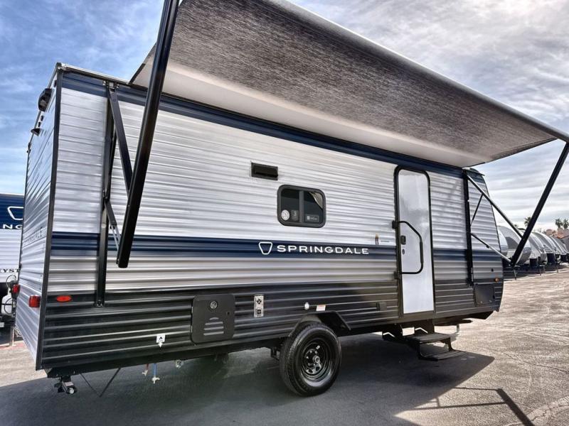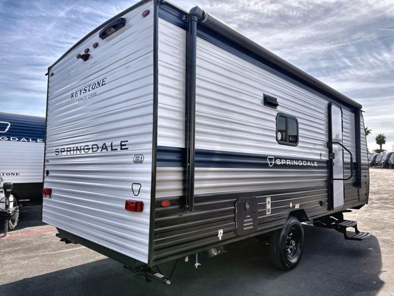 With any Springdale Mini travel trailer by Keystone, you will enjoy lightweight towing thanks to their single axle! The XL tinted safety glass windows are ultra durable, and the power awning will provide protection from the sun as you relax in your camp chairs outside. Each model includes blackout night shades, LED lighting, plus many more interior comforts. There is also a 20K BTU furnace to keep you comfortable, plus a tankless water heater for endless hot showers!