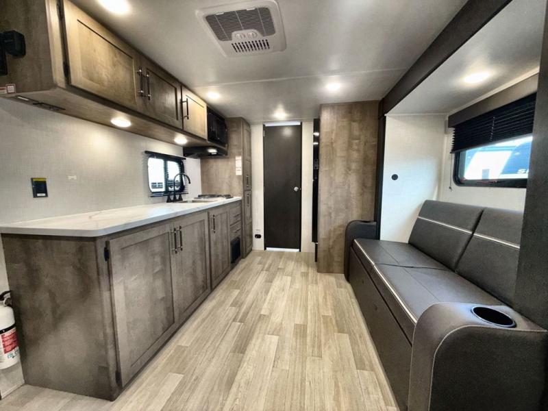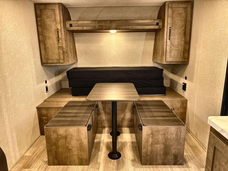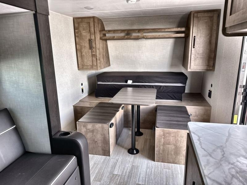 Camping trips just got easier travel trailer that can sleep three to four each night! You'll enjoy more floor space to move about thanks to the sofa slide out, and the full bath is tucked in the back for added privacy. There is generous counter space in the kitchen, along with a two-burner cooktop and microwave oven to cook meals. Up front, you'll find a picnic table to dine at, plus a Murphy style pull-out Olympic RV queen-size bed, giving you both seating and sleeping space. Dual bedside wardrobes will let you keep your clothes organized, and an exterior pass-through storage will be perfect for fishing poles, camp chairs and more!