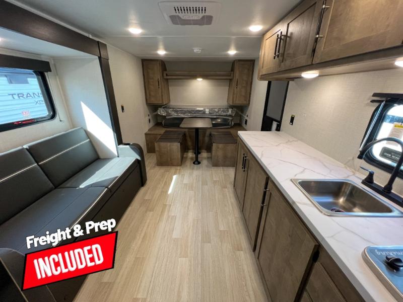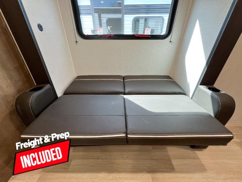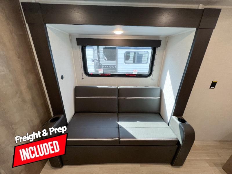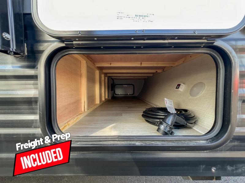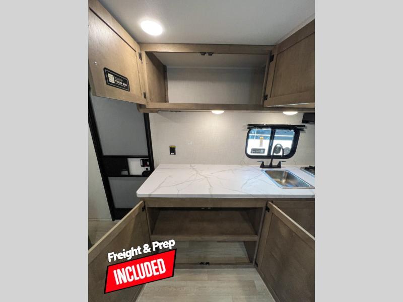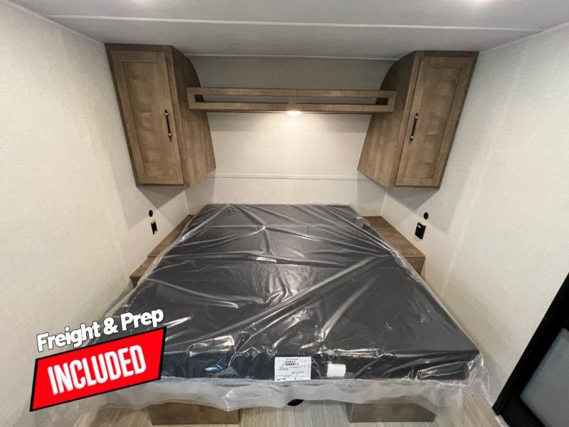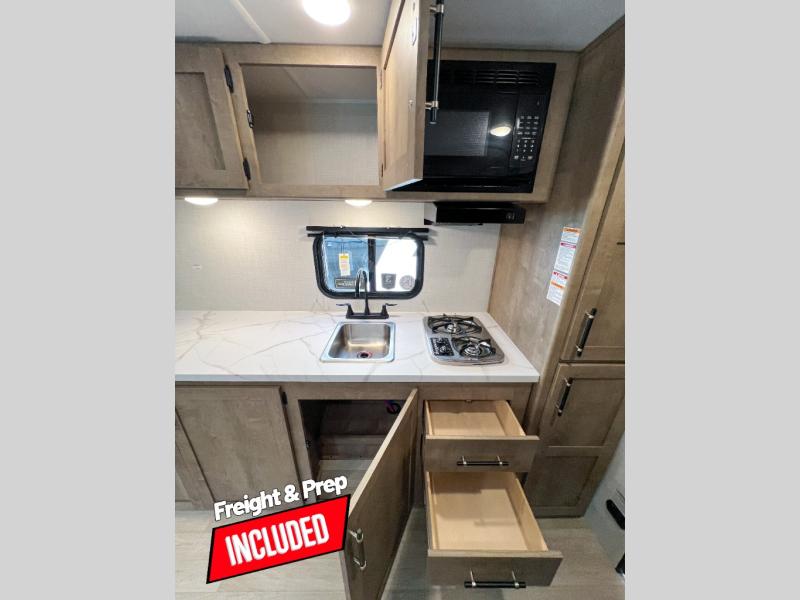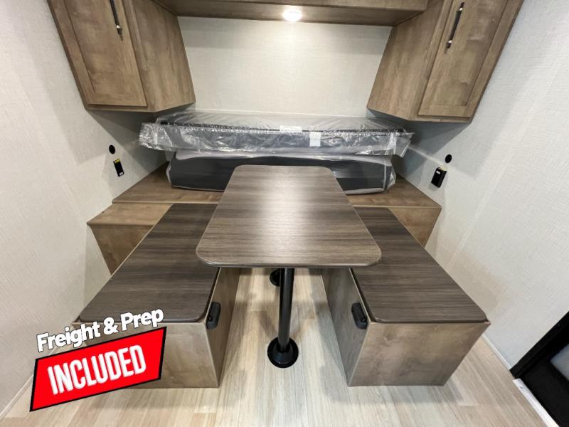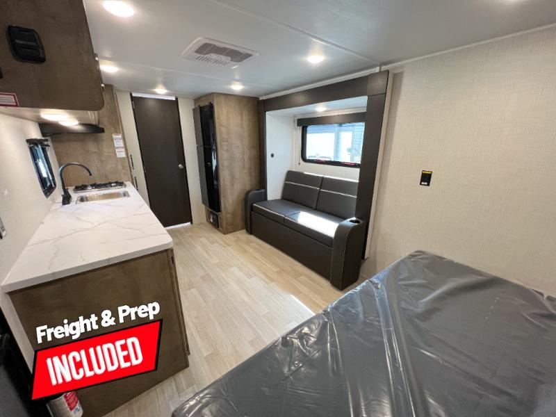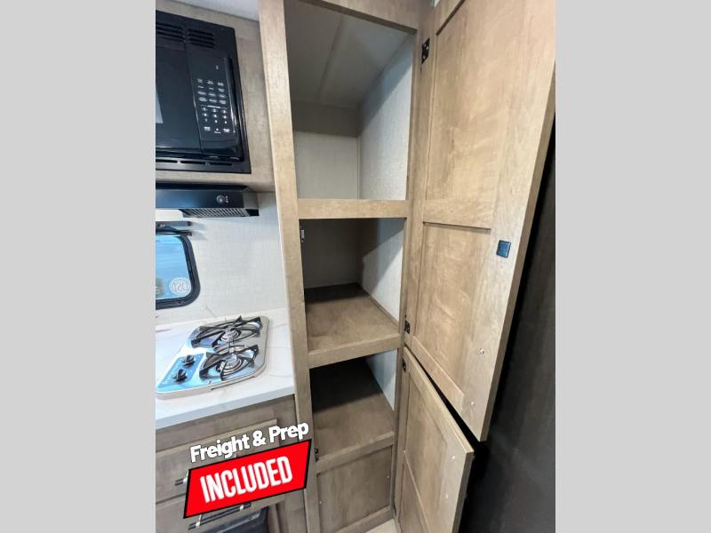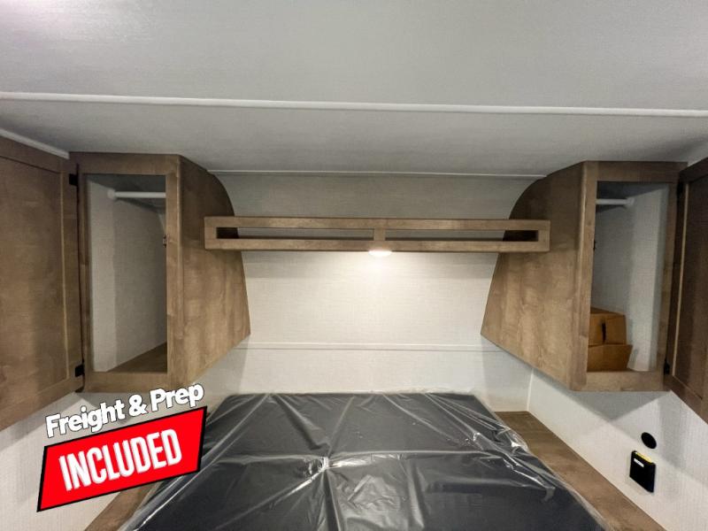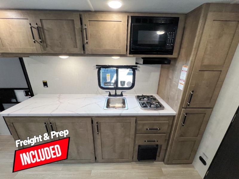 Camping trips just got easier travel trailer that can sleep three to four each night! You'll enjoy more floor space to move about thanks to the sofa slide out, and the full bath is tucked in the back for added privacy. There is generous counter space in the kitchen, along with a two-burner cooktop and microwave oven to cook meals. Up front, you'll find a picnic table to dine at, plus a pull-out Olympic RV queen-size bed, giving you both seating and sleeping space. Dual bedside wardrobes will let you keep your clothes organized, and an exterior pass-through storage will be perfect for fishing poles, camp chairs and more!