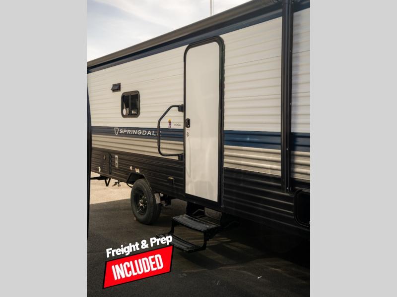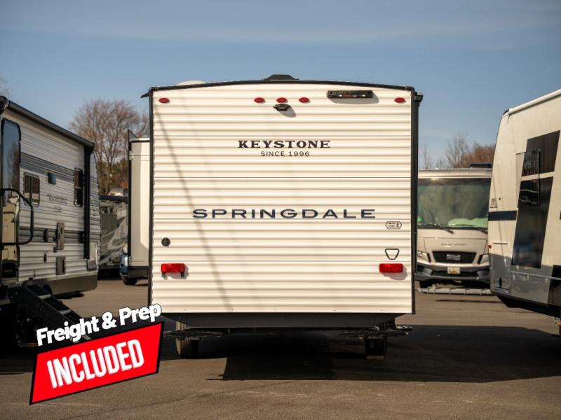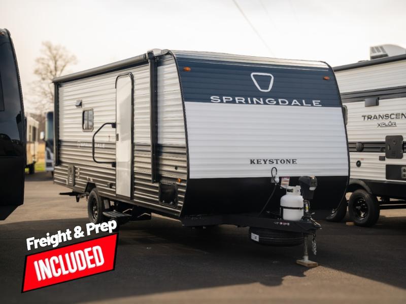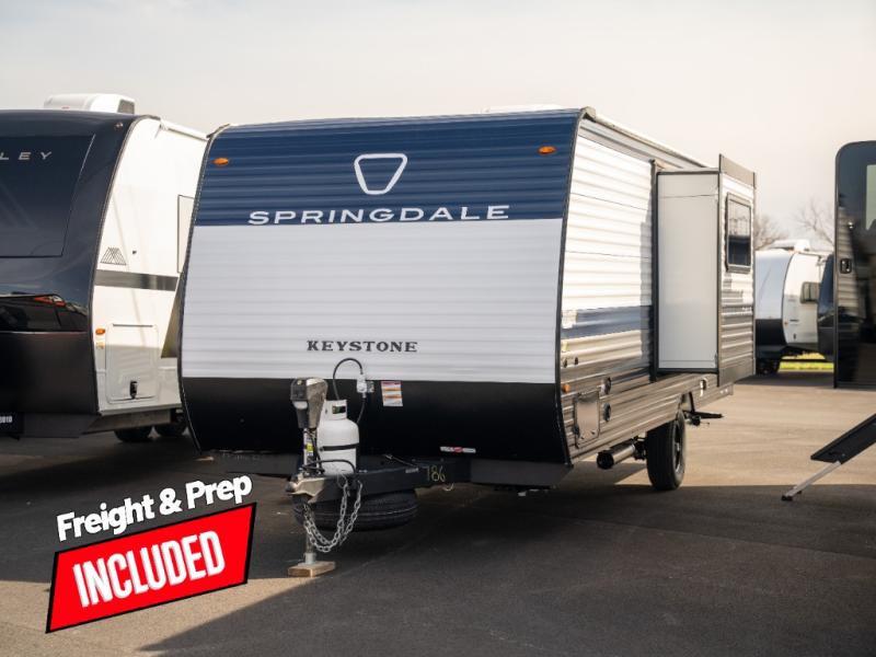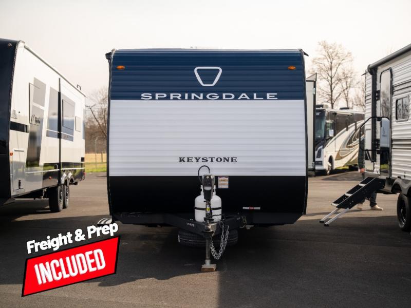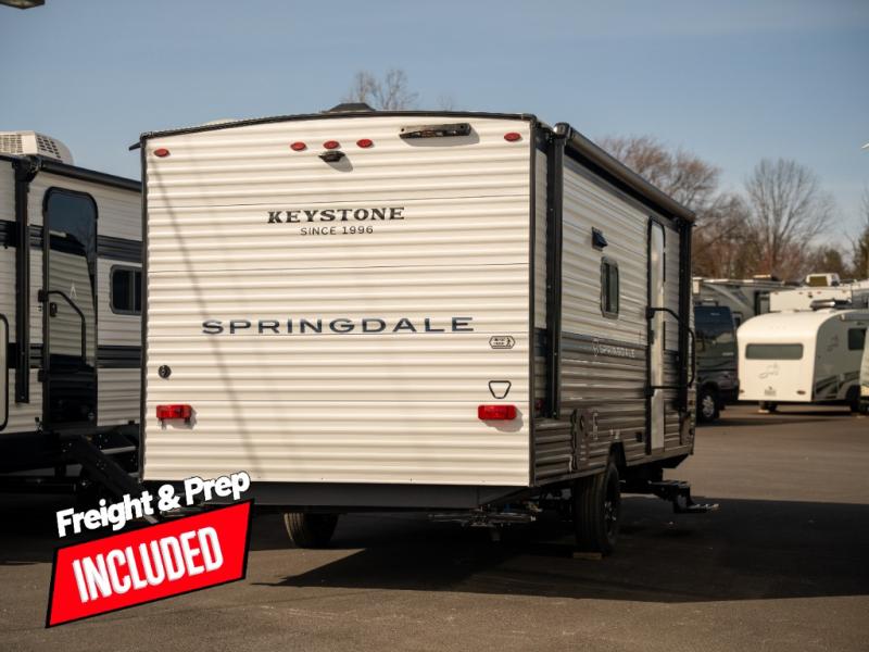 With any Springdale Mini travel trailer by Keystone, you will enjoy lightweight towing thanks to their single axle! The XL tinted safety glass windows are ultra durable, and the power awning will provide protection from the sun as you relax in your camp chairs outside. Each model includes blackout night shades, LED lighting, plus many more interior comforts. There is also a 20K BTU furnace to keep you comfortable, plus a tankless water heater for endless hot showers!